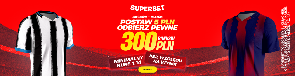 Za dowolny typ na mecz Newcastle United kontra Barcelona o stawce 5 PLN Superbet wypłaca pewne 300 PLN.