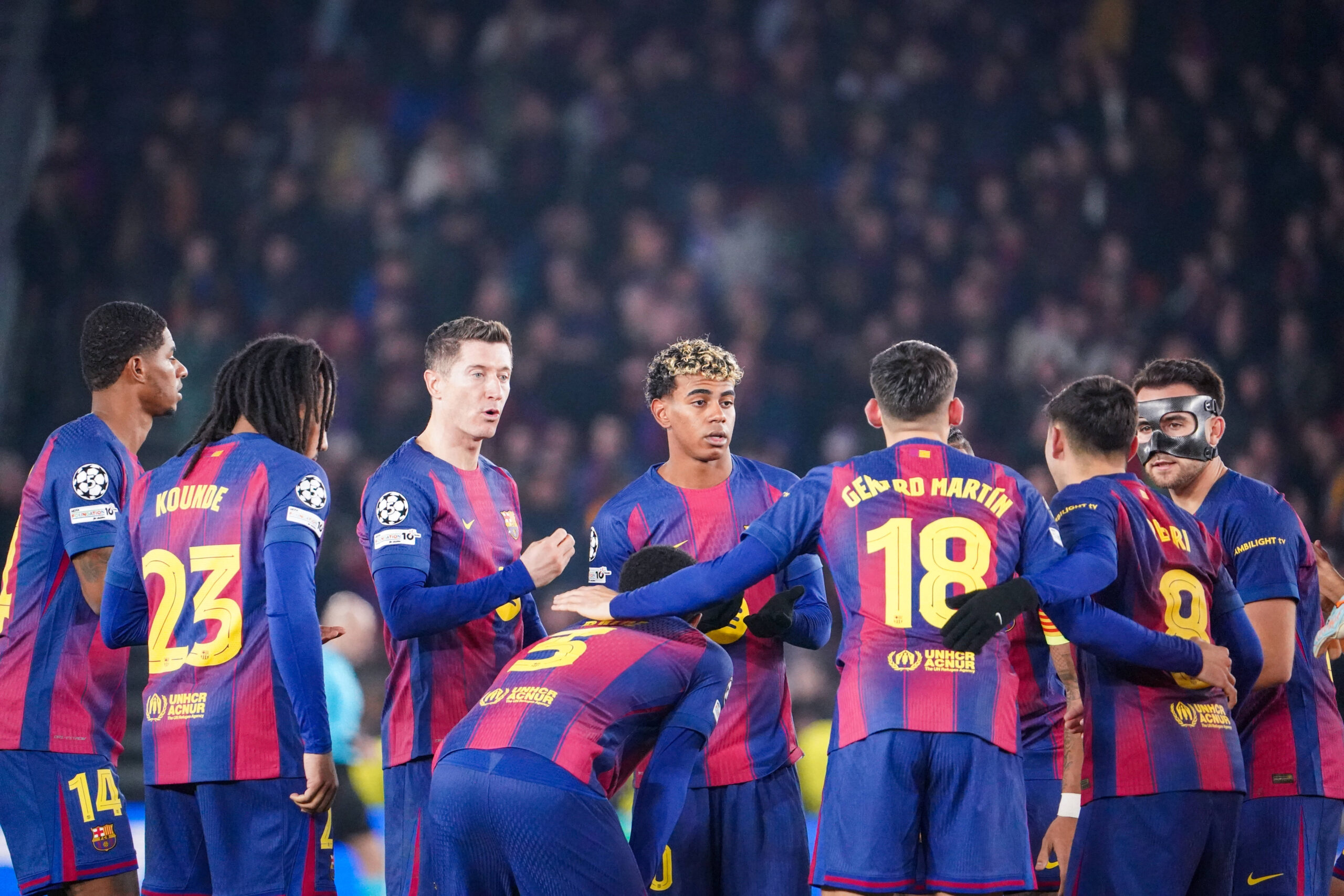 Fussball UEFA Champions League 2025/26, 6. Spieltag - FC Barcelona, Barca vs Eintracht Frankfurt - Camp Nou Barcelona: Mannschaftsansprache von Lamine Yamal FC Barcelona, 10 und Robert Lewandowski FC Barcelona, 9 Barcelona Provinz Barcelona Spanien *** Football UEFA Champions League 2025 26, Matchday 6 FC Barcelona vs Eintracht Frankfurt Camp Nou Barcelona Team speech by Lamine Yamal FC Barcelona, 10 and Robert Lewandowski FC Barcelona, 9 Barcelona Province of Barcelona Spain Copyright: xJOERANxSTEINSIEKx