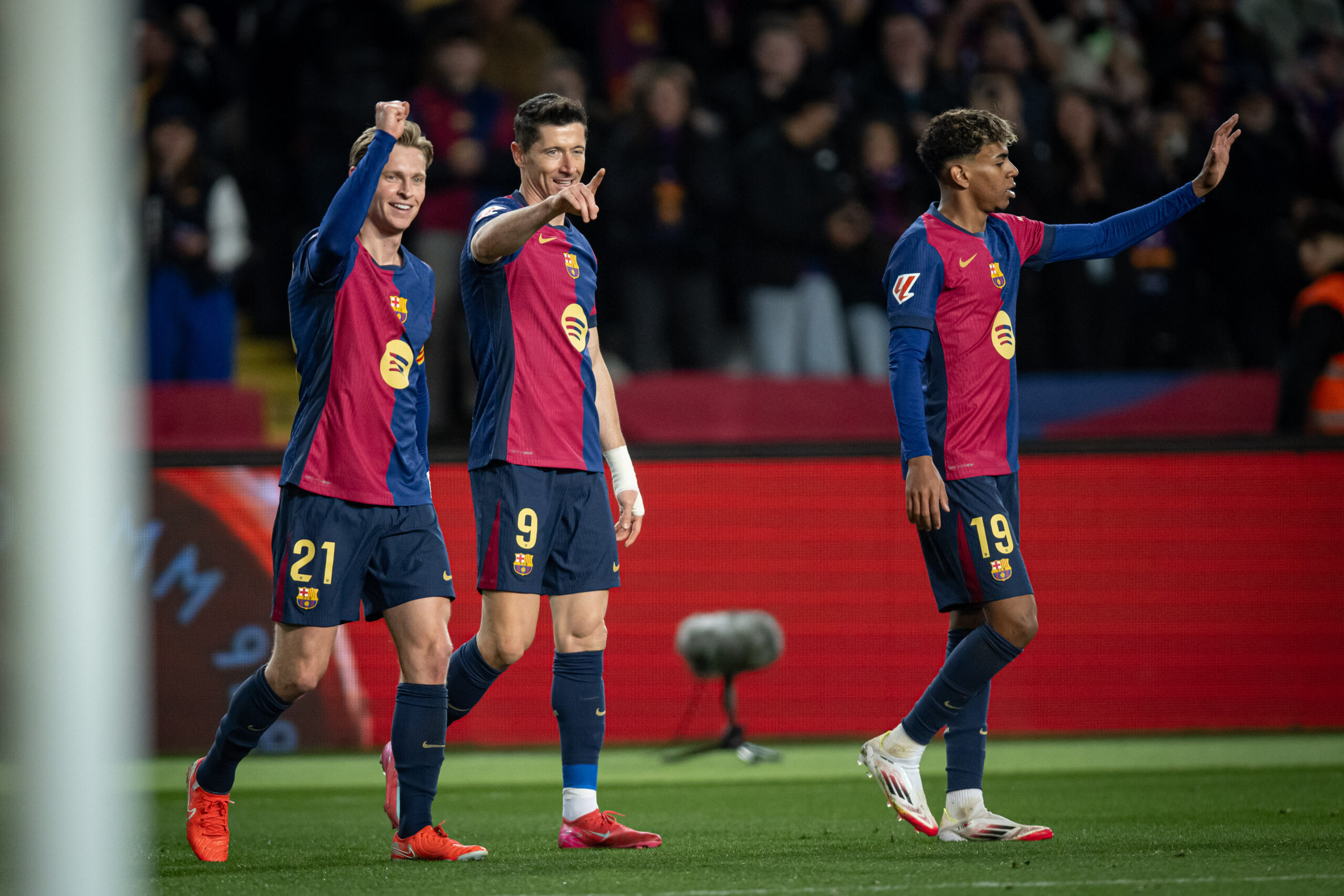 Frankie De Jong (FC Barcelona), Robert Lewandowski (FC Barcelona) and Lamine Yamal (FC Barcelona) are seen during a La Liga EA Sports match between FC Barcelona and Valencia CF at Estadi Olimpic Llu’s Companys in Barcelona, Barcelona, Spain, on January 26 2025. Photo by Felipe Mondino / Sipa USA