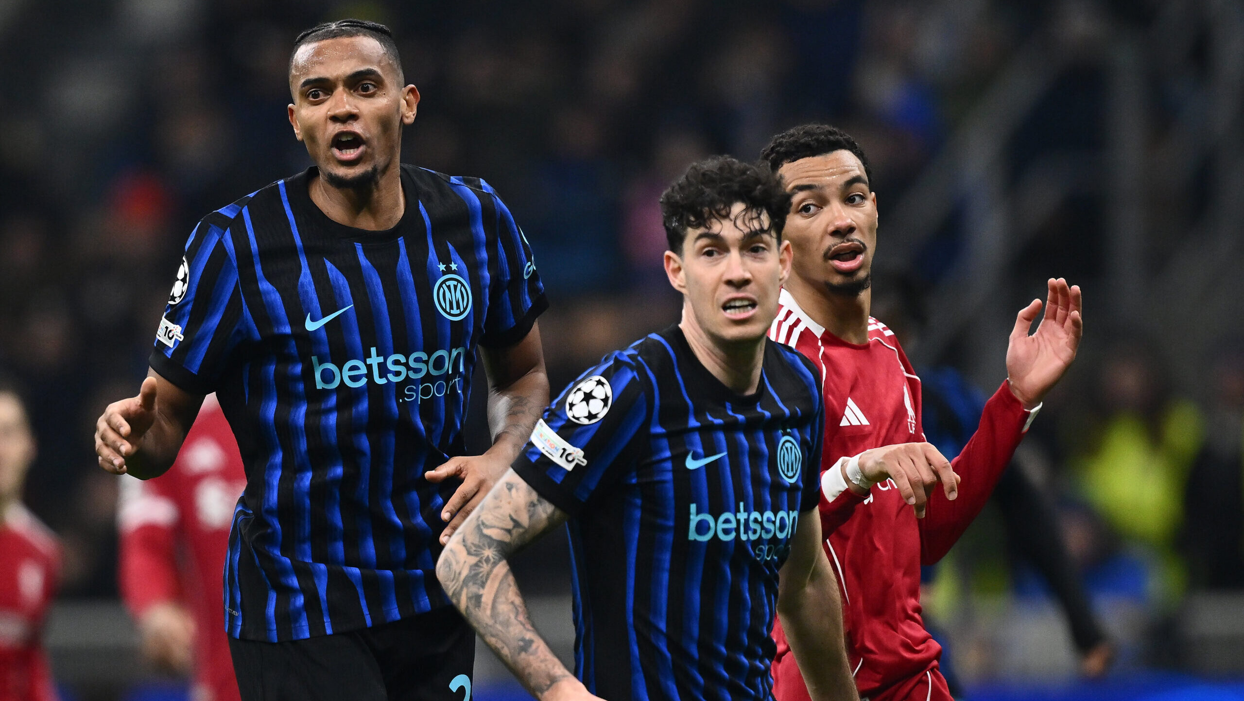 Manuel Akanji of F.C. Inter, Alessandro Bastoni of F.C. Inter and Hugo Ekitike of Liverpool F.C. are in action during the UEFA Champions League phase day 6 football match between F.C. Inter and Liverpool F.C. at the San Siro Stadium on December 9, 2025 in Milan, Italy. (Photo by Domenico Cippitelli/IPA Sport / ipa-agency.net/IPA/Sipa USA)