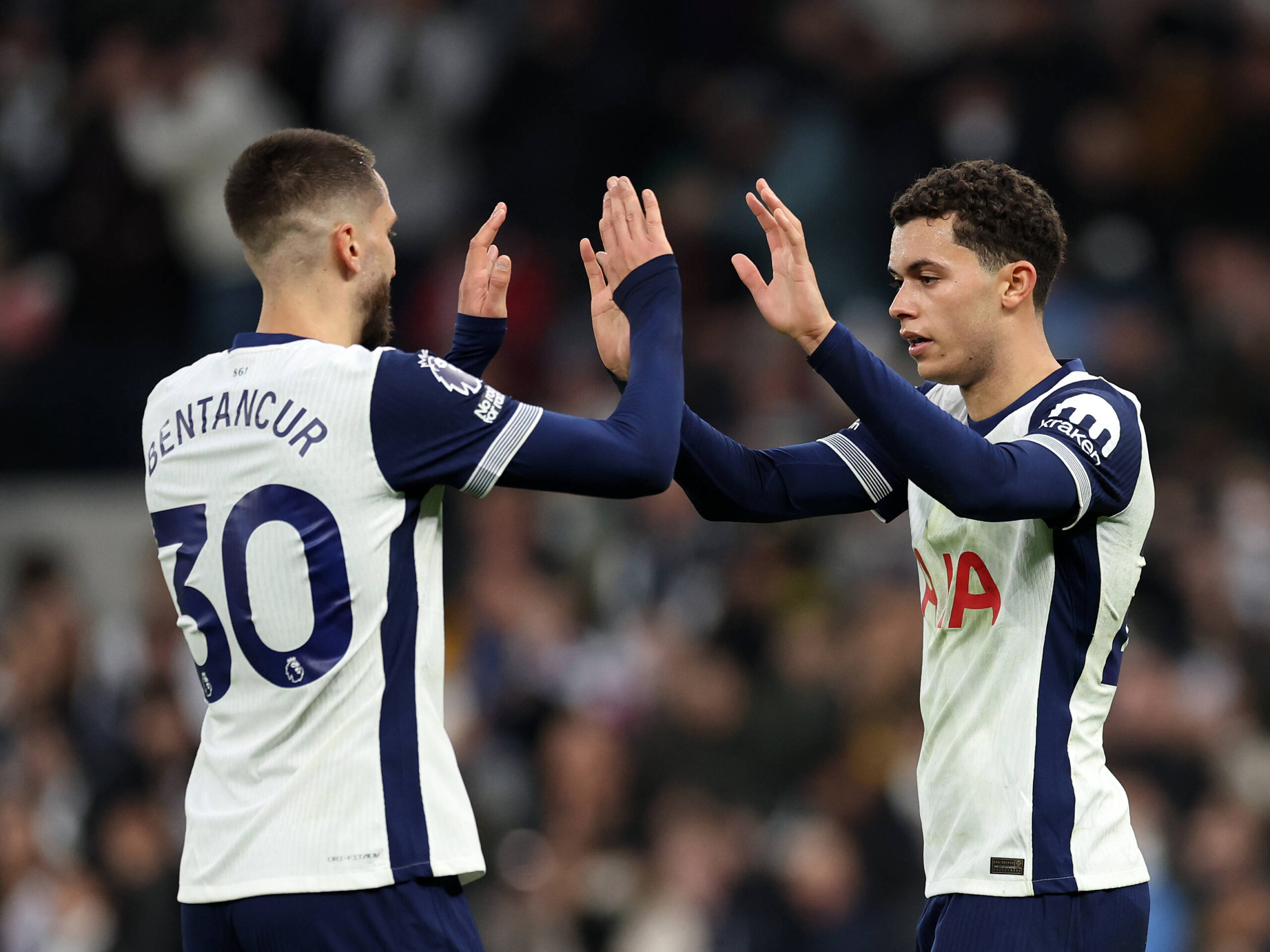 London, England, 29th December 2024. Brennan Johnson of Tottenham celebrates his goal with Rodrigo Bentancur of Tottenham during the Premier League match at the Tottenham Hotspur Stadium, London. Picture credit should read: David Klein / Sportimage EDITORIAL USE ONLY. No use with unauthorised audio, video, data, fixture lists, club/league logos or live services. Online in-match use limited to 120 images, no video emulation. No use in betting, games or single club/league/player publications. SPI_DK_052_Tottenham_Wolves SPI-3562-0052