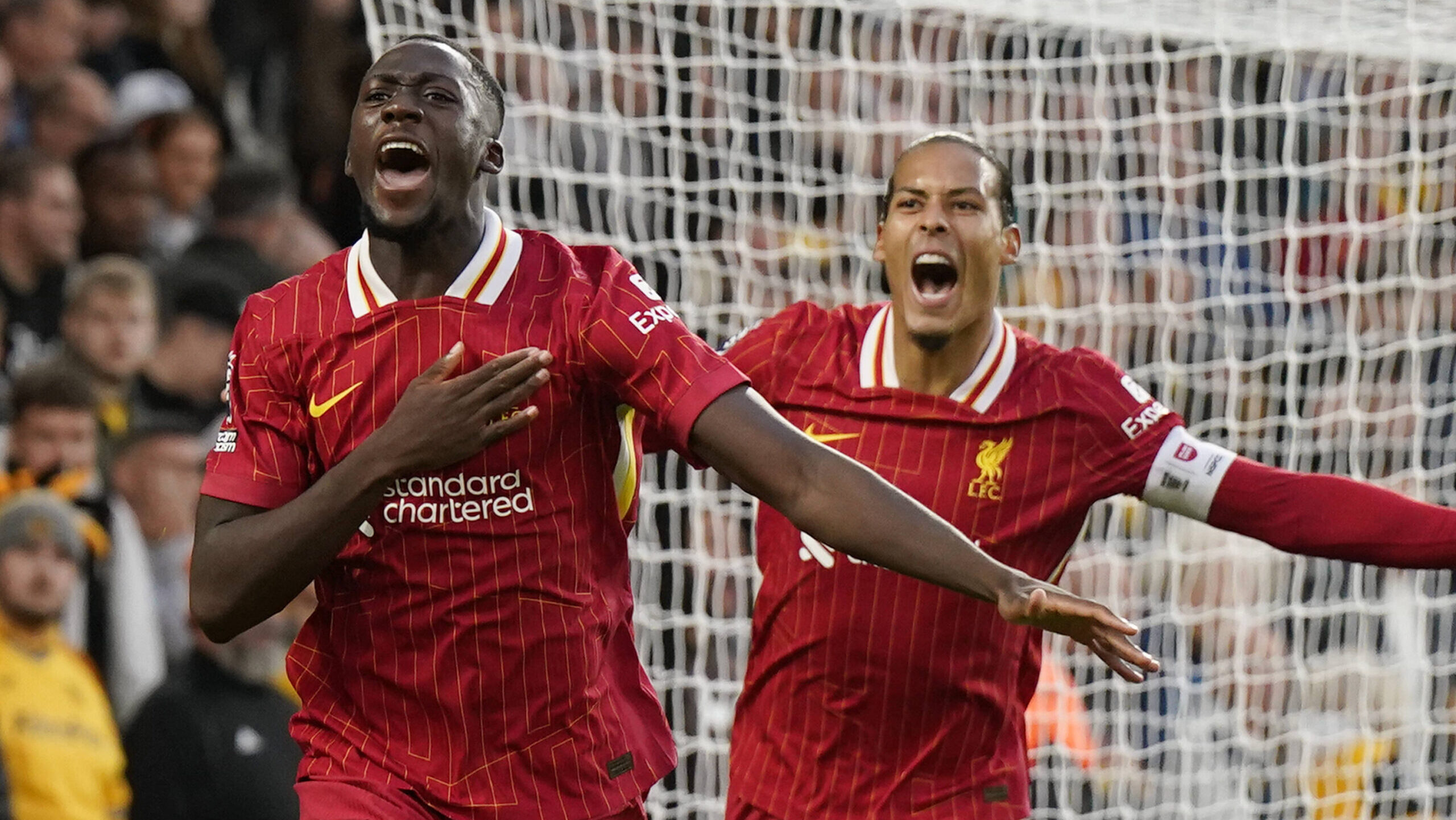 Wolverhampton, England, 28th September 2024. Ibrahima Konate of Liverpool celebrates scoring the first goal during the Premier League match at Molineux, Wolverhampton. Picture credit should read: Andrew Yates / Sportimage EDITORIAL USE ONLY. No use with unauthorised audio, video, data, fixture lists, club/league logos or live services. Online in-match use limited to 120 images, no video emulation. No use in betting, games or single club/league/player publications. SPI-3342-0033