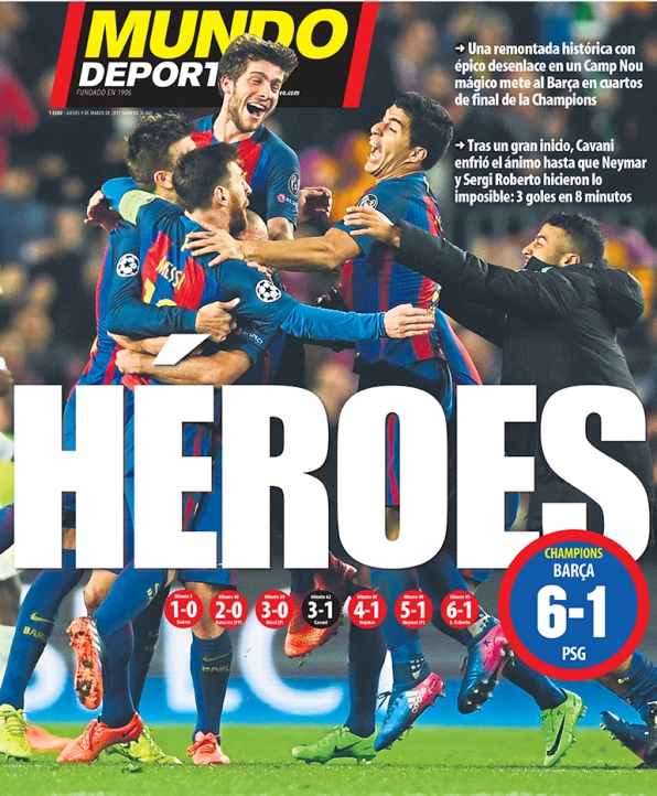W podobnym tonie swoją pomeczową relację utrzymuje katalońskie dziennik „Mundo Deportivo”, w których chwalono nie tylko piłkarzy i trenera Luisa Enrique, ale również kibiców, którzy stworzyli na Camp Nou znakomitą atmosferę. Dziennikarze zauważyli, że gol Edinsona Cavaniego złamał nieco morale w zespole, ale w końcówce Barcelona ponownie zagrała na swoim najlepszym poziomie, zdobywając trzy gole w ciągu zaledwie kilku minut.