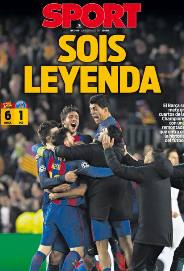 Dziennikarze „Sportu” umieścili na okładce cieszących się piłkarzy Barcelony, okraszając wszystko tytułem „Jesteście legendą”. W opisie środowych wydarzeń na Camp Nou można znaleźć m.i. stwierdzenie, że Duma Katalonii przeszła do następnej rundy Ligi Mistrzów po remontadzie, która już na stałe zapisze się na kartach historii światowego futbolu.