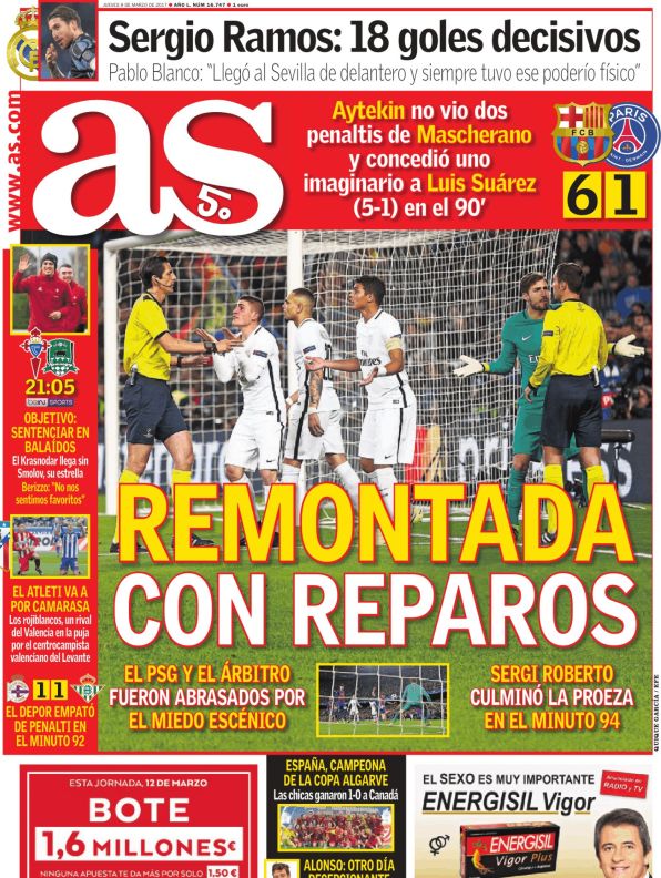 Nieco bardzo krytyczny jest madrycki dziennik „As”, który punktuje wszystkie kontrowersje wokół meczu. Zdaniem tego tytułu, sędzia nie wytrzymał presji związanej z tak ważnym spotkaniem, dyktując dla Barcelony niesłusznego karnego i nie zauważył dwóch fauli Javiera Mascherano, które powinny zakończyć się „jedenastkami” dla PSG.