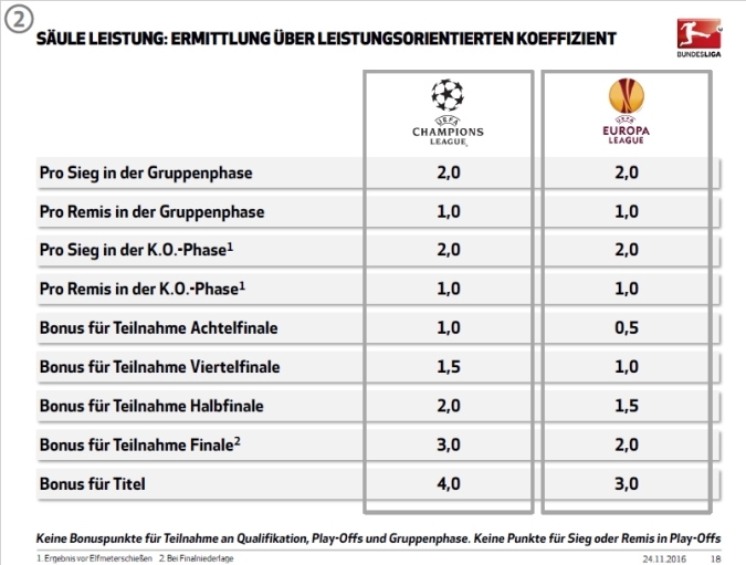 Usankcjonowano także podział środków z tytułu sprzedaży praw na rynek międzynarodowy. 2. Bundesliga otrzyma na sezon 2017/18 5 milionów euro do podziału, a z każdym kolejnym rokiem kwota ta będzie wzrastała o milion. O podziale tej puli decydować będą miejsca zajęte na koniec sezonu. Warto dodać, że do tej pory kluby 2. Bundesligi otrzymywały jedynie 1,8 miliona na sezon. Dla klubów 1. Bundesligi przygotowano natomiast 3 filary. Pierwszy nosi nazwę Solidarität, czyli solidarność i przeznaczono na niego 25 procent wpływów ze sprzedaży praw do pokazywania ligi za granicą. Kwota ta zostanie po równo rozdzielona na wszystkie kluby 1. Bundesligi, bez względu na zajmowane przez nich miejsce w tabeli. Drugi filar to Leistung (wyniki) i jest ściśle powiązany z rezultatami osiąganymi przez niemieckie kluby występujące w europejskich pucharach. DFL, wzorem UEFA, wprowadzi współczynniki, przy pomocy których będzie klasyfikować swoich reprezentantów w Europie za 5 ostatnich sezonów. Będzie się o co bić, bo na ten filar przewidziano aż 50 procent kwoty. Szczegóły naliczania punktów znajdziecie na grafice poniżej: