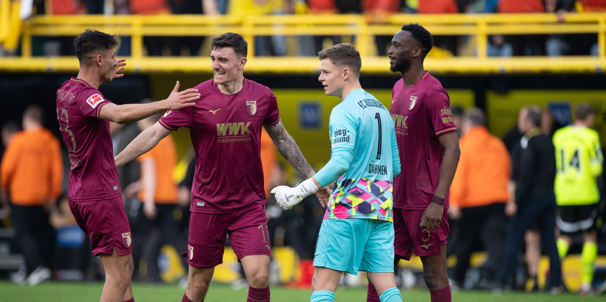 Schlussjubel FC Augsburg, Jubel, jubeln, Freude, cheers, v.l. Dimitrios GIANNOULIS A, Cedric ZEISIGER A, Torwart Finn DAHMEN A, Chrislain MATSIMA A Fussball 1. Bundesliga, 25. Spieltag, Borussia Dortmund DO - FC Augsburg A 0-1 am 08.03.2025 in Dortmund/ Deutschland. DFL regulations prohibit any use of photographs as image sequences and/or quasi-video  *** Final cheer FC Augsburg, cheer, jubilation, joy, cheers, v l Dimitrios GIANNOULIS A , Cedric ZEISIGER A , goalkeeper Finn DAHMEN A , Chrislain MATSIMA A Football 1 Bundesliga, 25 Matchday, Borussia Dortmund DO FC Augsburg A 0 1 on 08 03 2025 in Dortmund Germany DFL regulations prohibit any use of photographs as image sequences and or quasi video