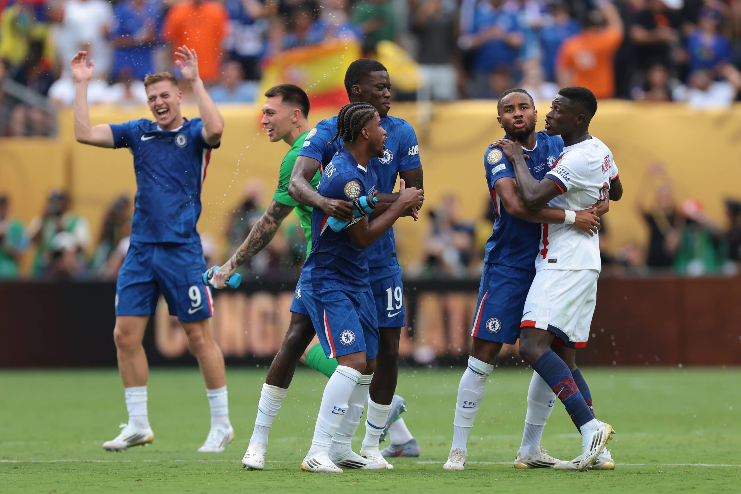 New Jersey, USA, 13th July 2025. Christopher Nkunku of Chelsea FC restrains Nuno Mendes of PSG as he clashes with Andrey Santos of Chelsea FC whom in turn is restrained by team mate Mamadou Sarr following the final whistle of the Chelsea vs Paris Saint Germain FIFA Club World Cup match at Metlife Stadium, New Jersey. Picture credit should read: Jonathan Moscrop / Sportimage EDITORIAL USE ONLY. No use with unauthorised audio, video, data, fixture lists, club/league logos or live services. Online in-match use limited to 120 images, no video emulation. No use in betting, games or single club/league/player publications. SPI_124_JM_CHELSEA_PSG_ SPI-4016-0124