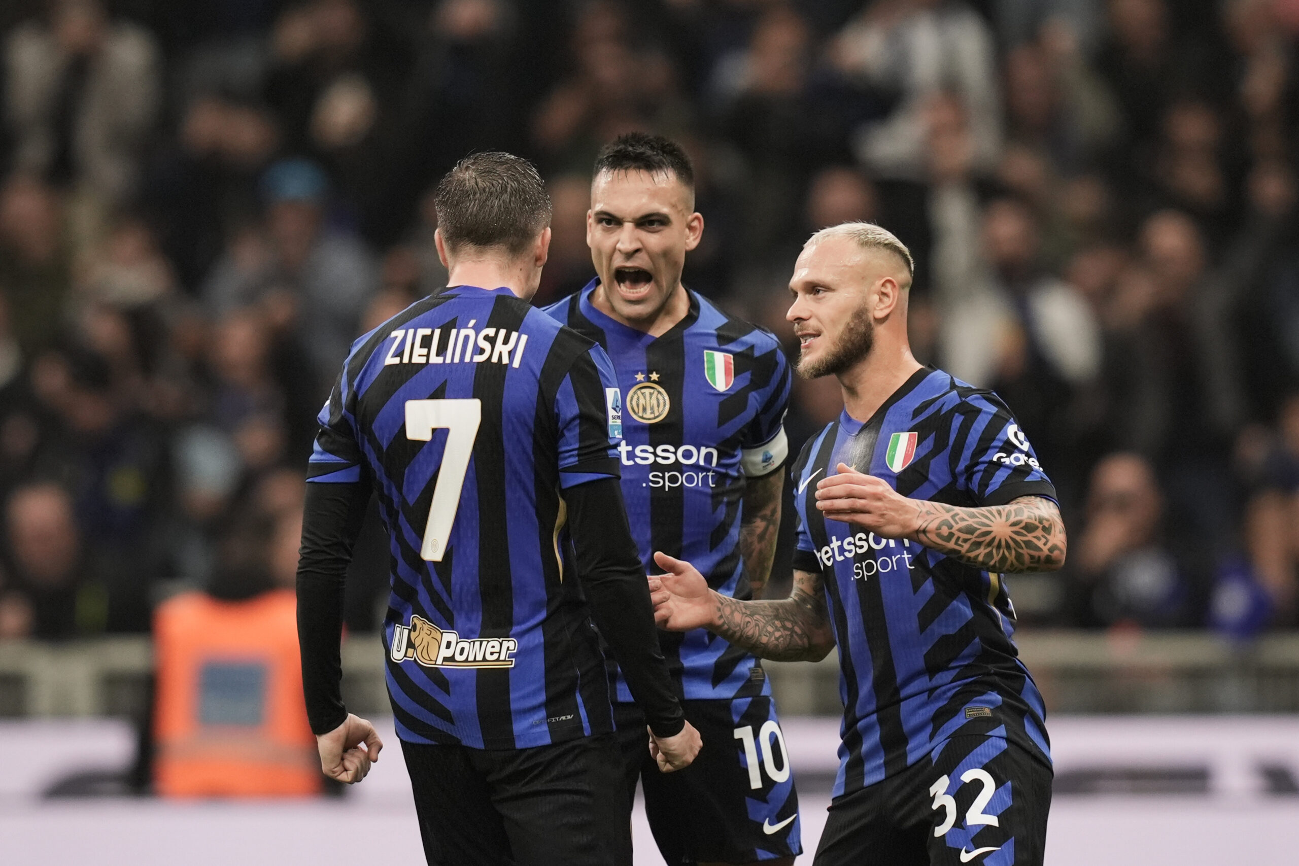 Inter Milan's Piotr Zielinski celebrates with Inter MilanÕs Lautaro Martinez after scoring the 3-2 goal for his team during the Serie A Enilive 2024/2025 match between Inter and Juventus at the San Siro Stadium in Milan, North Italy - Sport, Soccer Sunday October 27, 2024 (Photo by Massimo Paolone/LaPresse) (Photo by Massimo Paolone/LaPresse/Sipa USA)