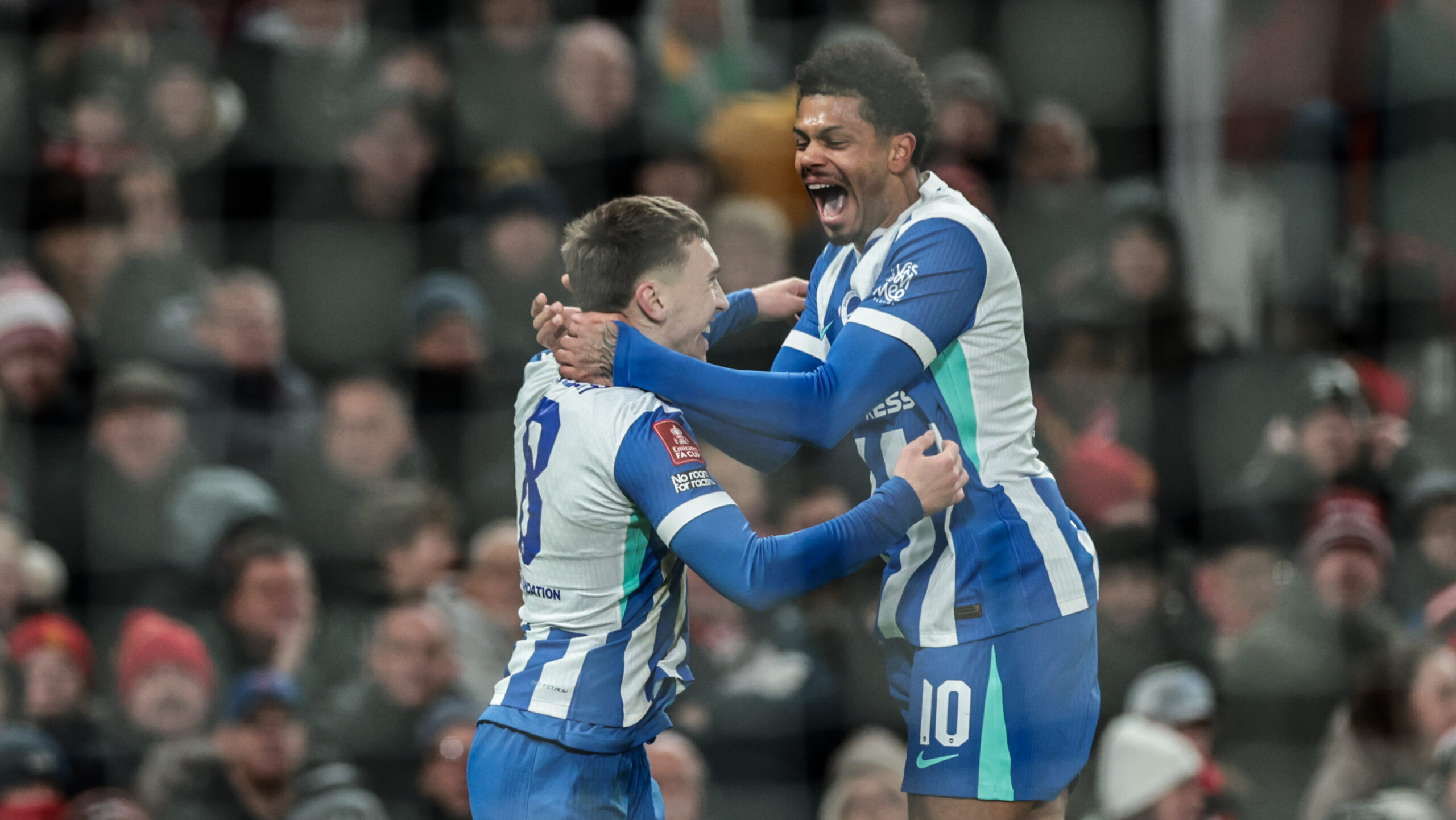 Brajan Gruda of Brighton & Hove Albion celebrates his goal to make it 0-1 during the Emirates FA Cup Third Round match Manchester United vs Brighton and Hove Albion at Old Trafford, Manchester, United Kingdom, 11th January 2026