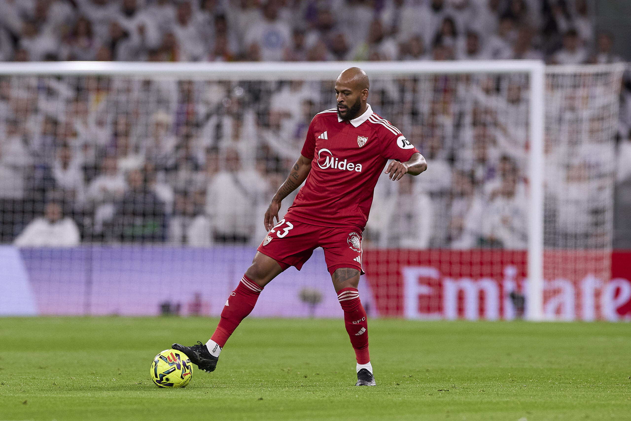 Marcos do Nascimento Teixeira, known as Marcao of Sevilla FC seen in action during the La Liga EA Sports 2025/2026 week 17 football match between Real Madrid CF and Sevilla FC at Santiago Bernabeu Stadium. Final score: Real Madrid CF 2:0 Sevilla FC. (Photo by Federico Titone / SOPA Images/Sipa USA)