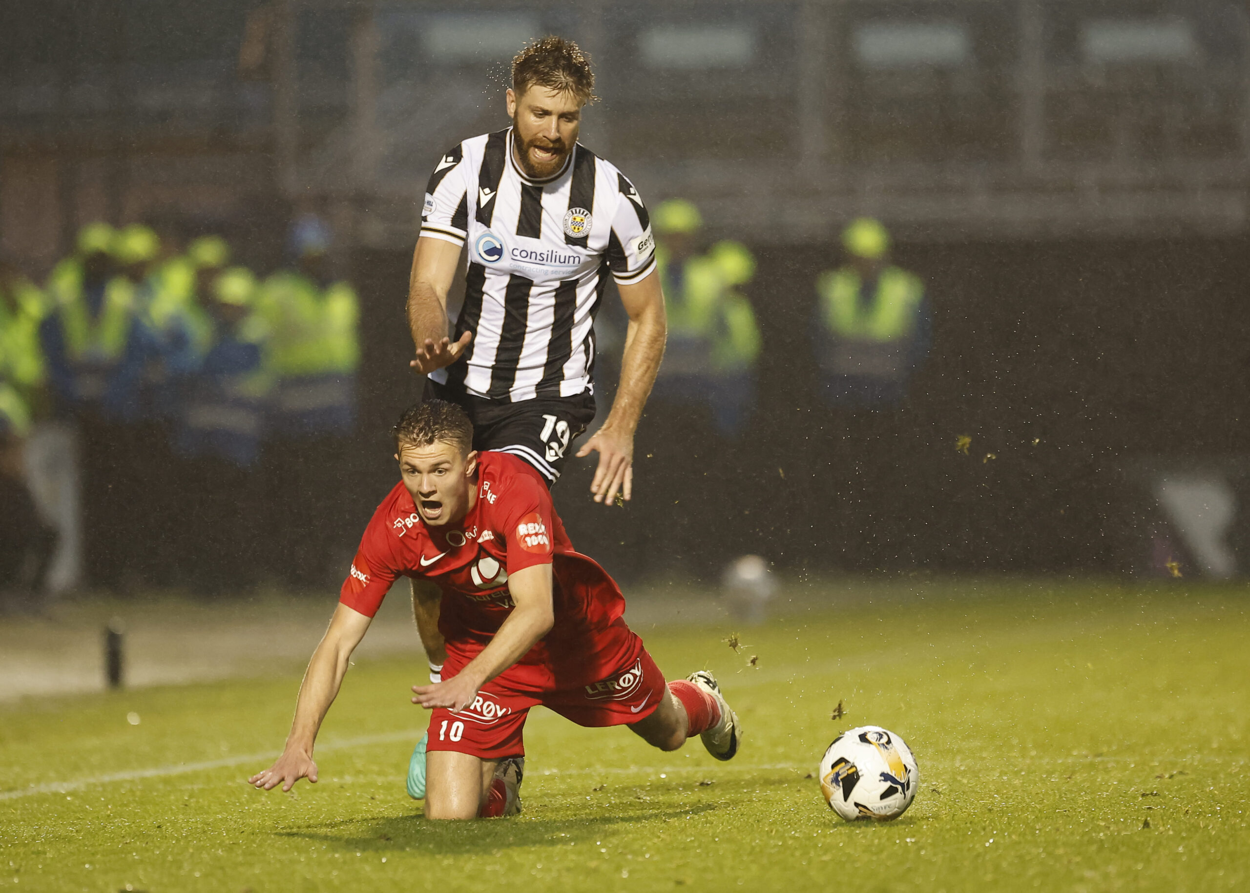 Shaun Rooney of St Mirren (left) and Emil Kornvig of Sportsklubben Brann compete for the ball during the UEFA Europa Conference League Third Qualifying Round First Leg match at the SMISA Stadium, Paisley