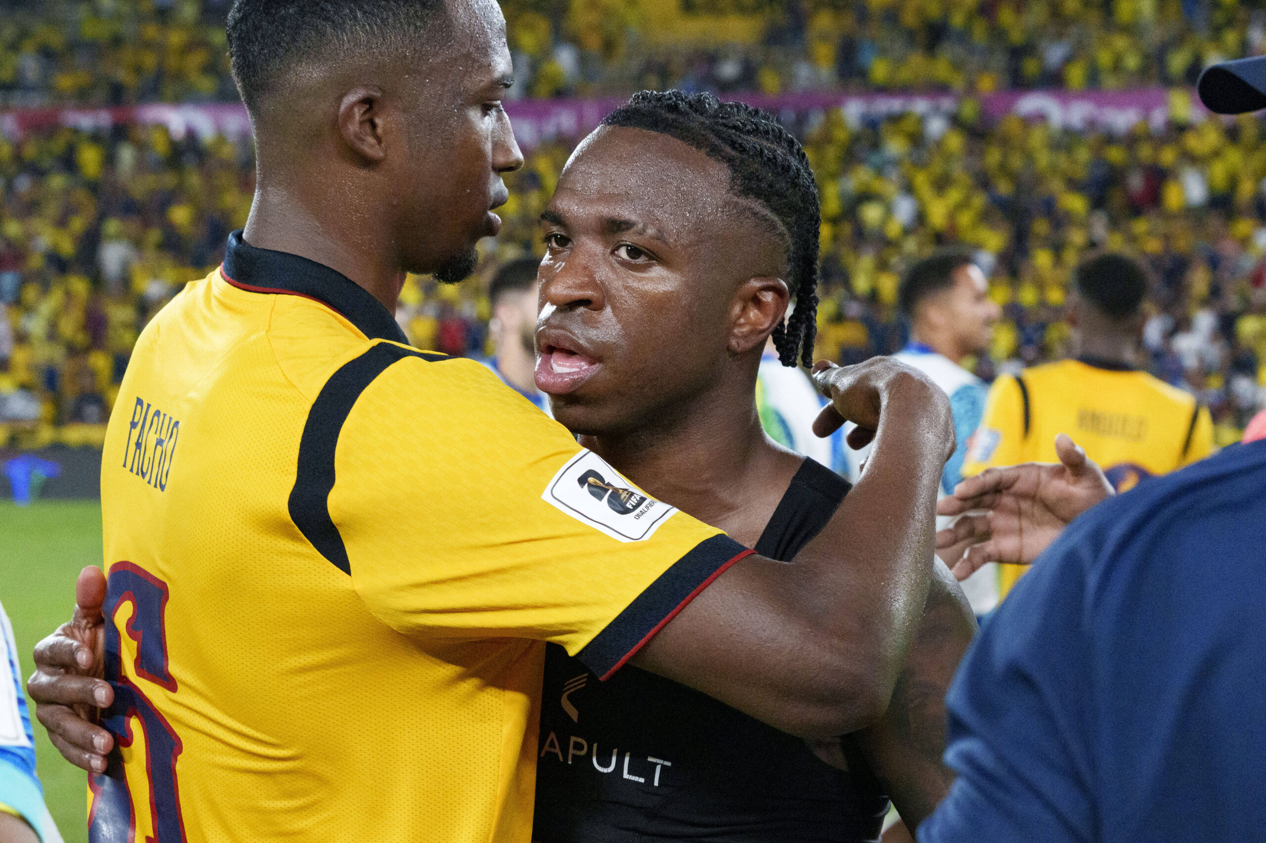 Guayaquil, Ecuador - June 05: Vinicius Junior of Brazil salutes fellow player Willian Pacho of Ecuador during the FIFA World Cup, WM, Weltmeisterschaft, Fussball 2026 Qualifier match between Ecuador and Brazil at Estadio Banco Pichincha on June 05, 2025 in Guayaquil, Ecuador. Photo by Enrique Gonzalez/Eurasia Images Guayaquil Estadio Banco Pichincha Ecuador *** Guayaquil, Ecuador June 05 Vinicius Junior of Brazil salutes fellow player Willian Pacho of Ecuador during the FIFA World Cup 2026 Qualifier match between Ecuador and Brazil at Estadio Banco Pichincha on June 05, 2025 in Guayaquil, Ecuador Photo by Enrique Gonzalez Eurasia Sport Images Guayaquil Estadio Banco Pichincha Ecuador Copyright: x x2025xEurasiaxSportxImagesx jp-en-EuSpIm-MF5_EGZ_Brazil_Ecuador_05Jun2025_EC116