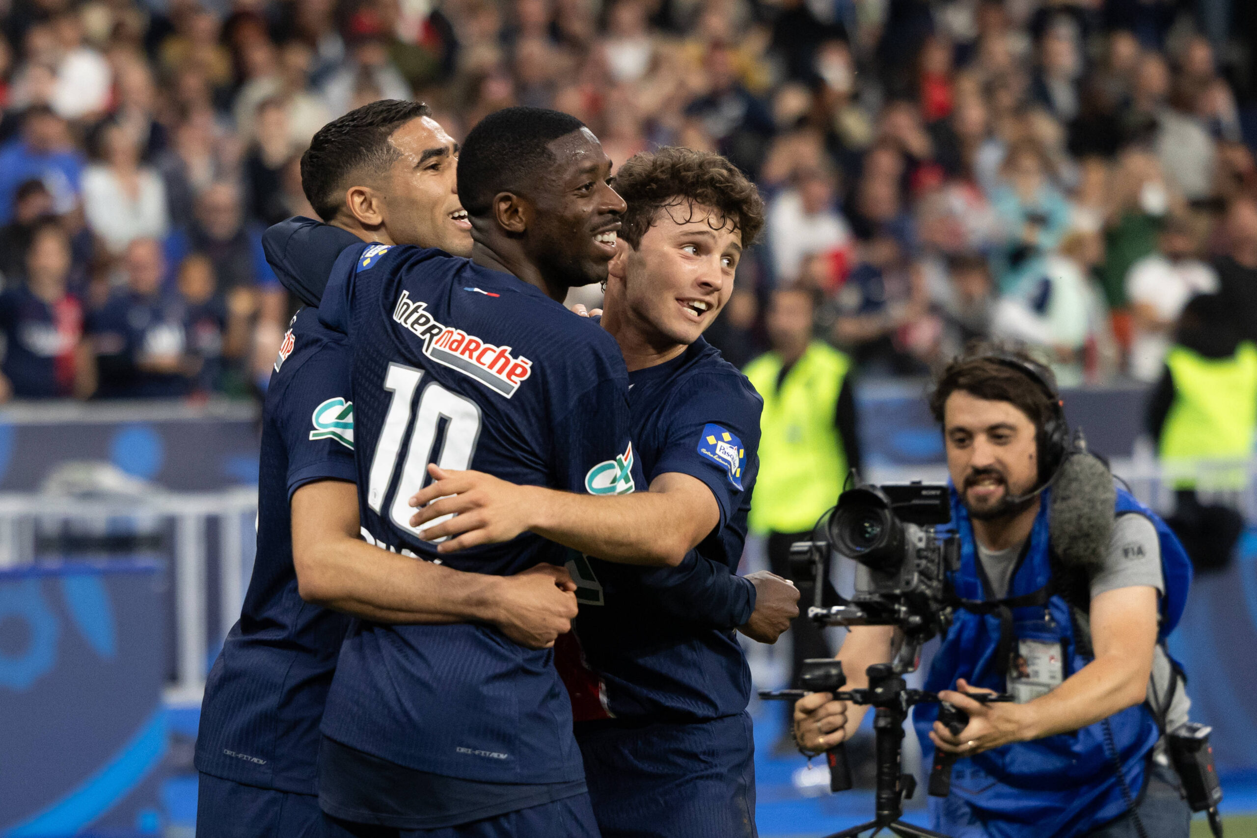Saint Denis, France, May 24, 2025 - French Cup final football match between Paris Saint Germain PSG and Stade de Reims at the Stade de France - Moroccan defender 02 Achraf Hakimi L, French forward 10 Ousmane Dembele C and Portuguese midfielder 87 Joao Neves R celebrate after the first one scores. PUBLICATIONxNOTxINxFRA Copyright: xAlexisxSciardx PUBLICATIONxNOTxINxFRA Copyright: xIMAGO/AlexisxSciardx