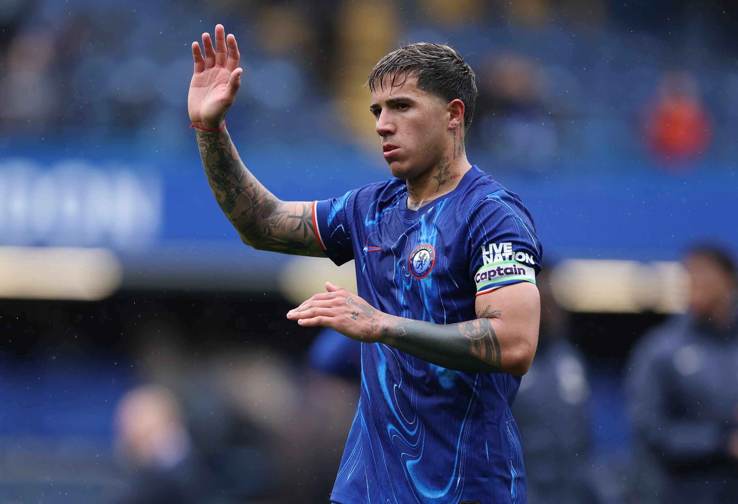 London, England, 13th April 2025. Enzo Fernandez of Chelsea gestures to the fans after the Chelsea vs Ipswich Town Premier League match at Stamford Bridge, London. Picture credit should read: Paul Terry / Sportimage EDITORIAL USE ONLY. No use with unauthorised audio, video, data, fixture lists, club/league logos or live services. Online in-match use limited to 120 images, no video emulation. No use in betting, games or single club/league/player publications. SPI_059_PT_Chelsea_Ipswich SPI-3827-0059