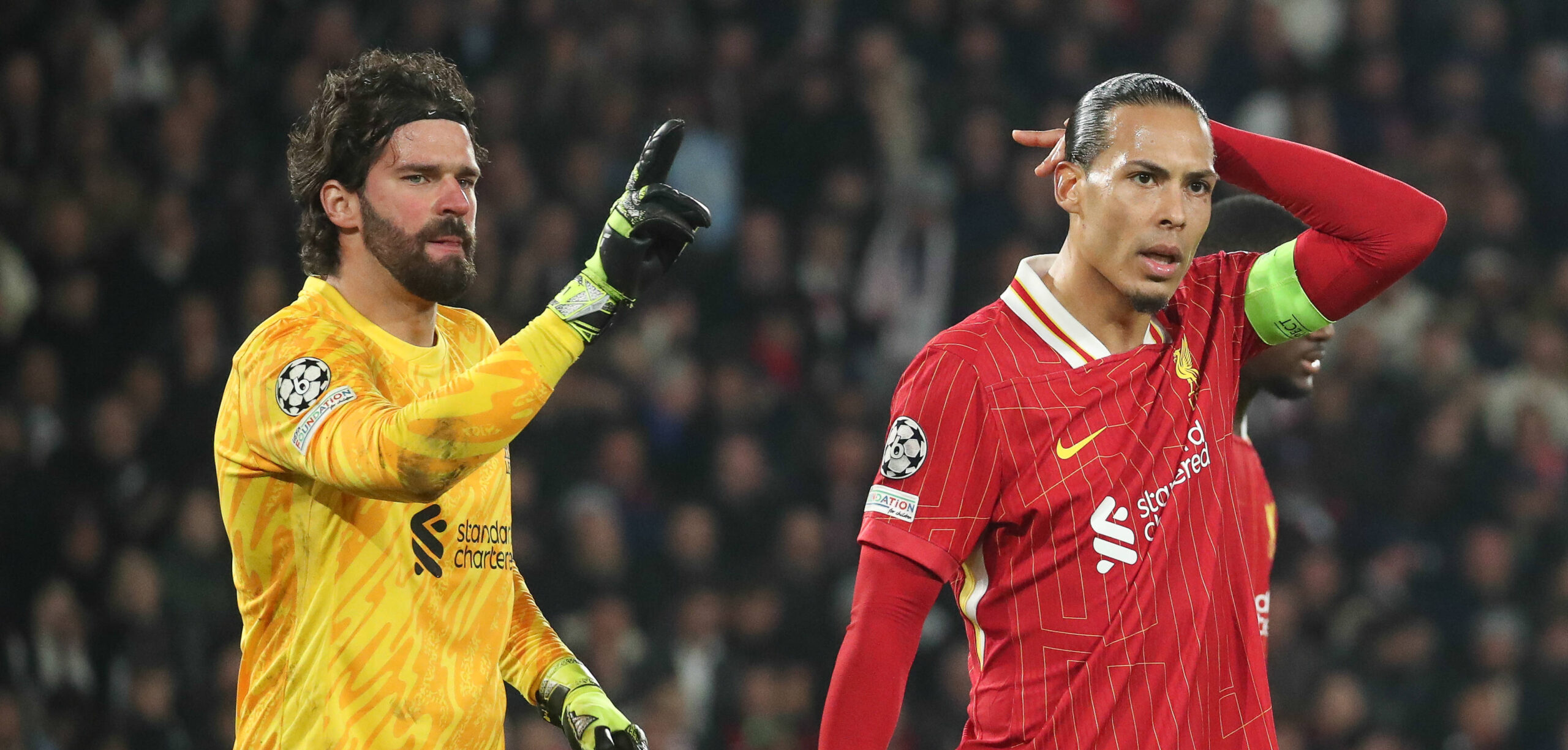 Liverpool's Brazilian goalkeeper Alisson Becker (L) gestures next to his captain Virgil Van Dijk during the UEFA Champions League, Round of 16, first leg football match between Paris Saint-Germain (PSG) and Liverpool FC the Parc des Princes stadium in Paris, FRANCE - 05/03/2025.//JEE_psgliv.21/Credit:J.E.E/SIPA/2503070125