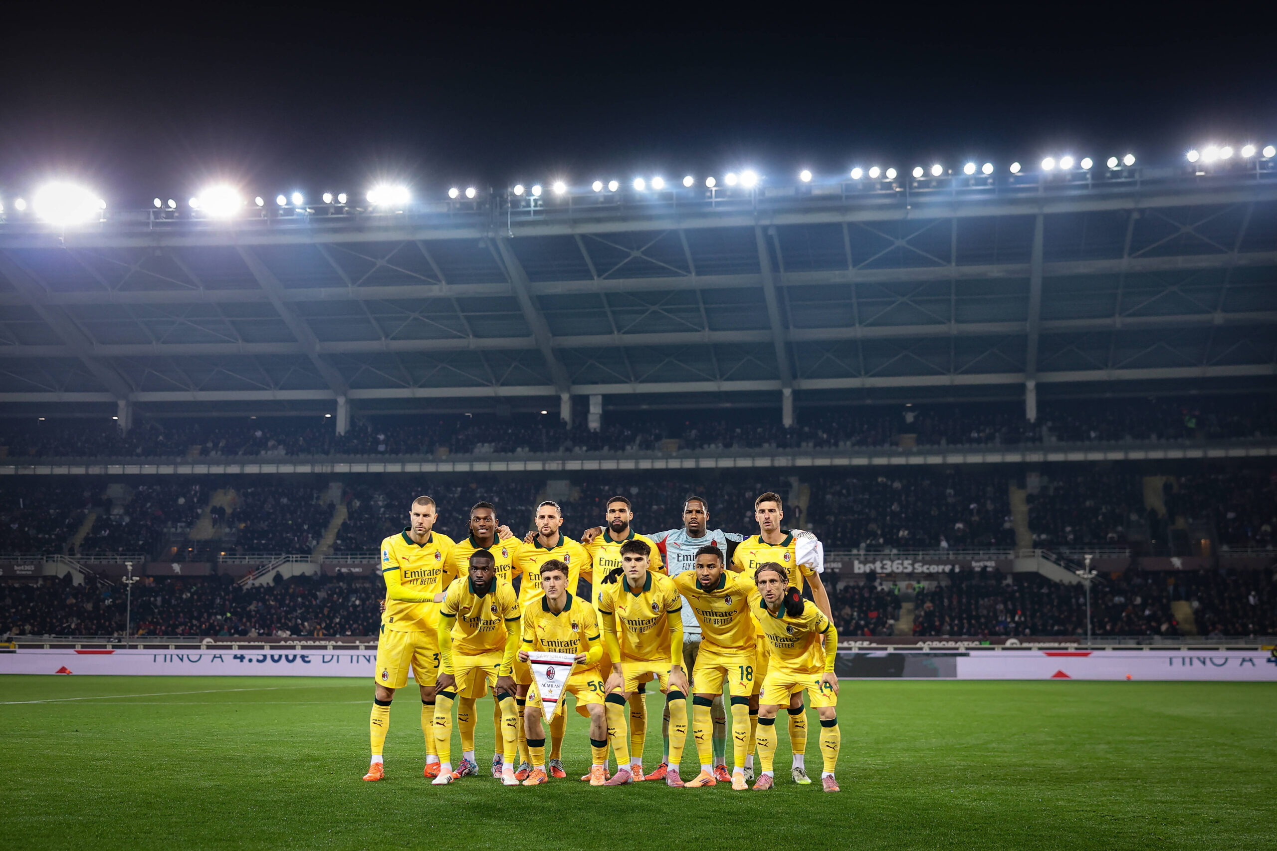 Turin, Italy, 8th December 2025. The AC Milan starting eleven line up for a team photo prior to kick off, back row  L to R  Strahinja Pavlovic, Rafael Leao, Adrien Rabiot, Ruben Loftus-Cheek, Mike Maignan and Matteo Gabbia, front row  L to R  Fikayo Tomori, Alexis Saelemaekers, Davide Bartesaghi, Christopher Nkunku and Luka Modric, in the Torino vs AC Milan Serie A match at Stadio Grande Torino, Turin. Picture credit should read: Jonathan Moscrop / Sportimage EDITORIAL USE ONLY. No use with unauthorised audio, video, data, fixture lists, club/league logos or live services. Online in-match use limited to 120 images, no video emulation. No use in betting, games or single club/league/player publications. SPI_266_JM_TORO_MILAN SPI-4323-0266