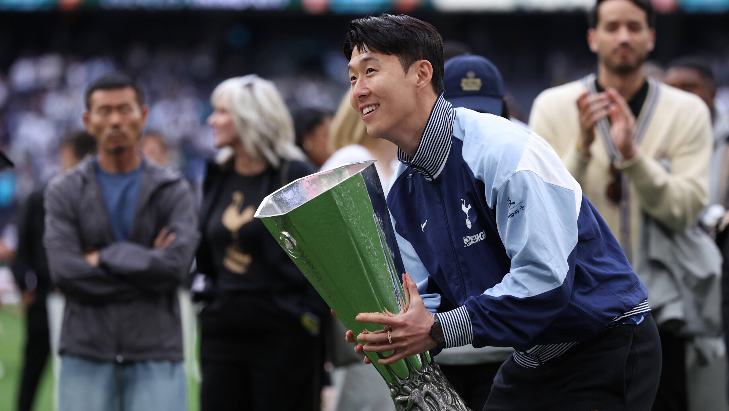 London, England, 25th May 2025. Son Heung-Min of Tottenham Hotspur with the Europa League Trophy after the Tottenham Hotspur vs Brighton and Hove Albion Premier League match at the Tottenham Hotspur Stadium, London. Picture credit should read: Paul Terry / Sportimage EDITORIAL USE ONLY. No use with unauthorised audio, video, data, fixture lists, club/league logos or live services. Online in-match use limited to 120 images, no video emulation. No use in betting, games or single club/league/player publications. SPI_165_PT_Tottenham_Brighton SPI-3959-0165