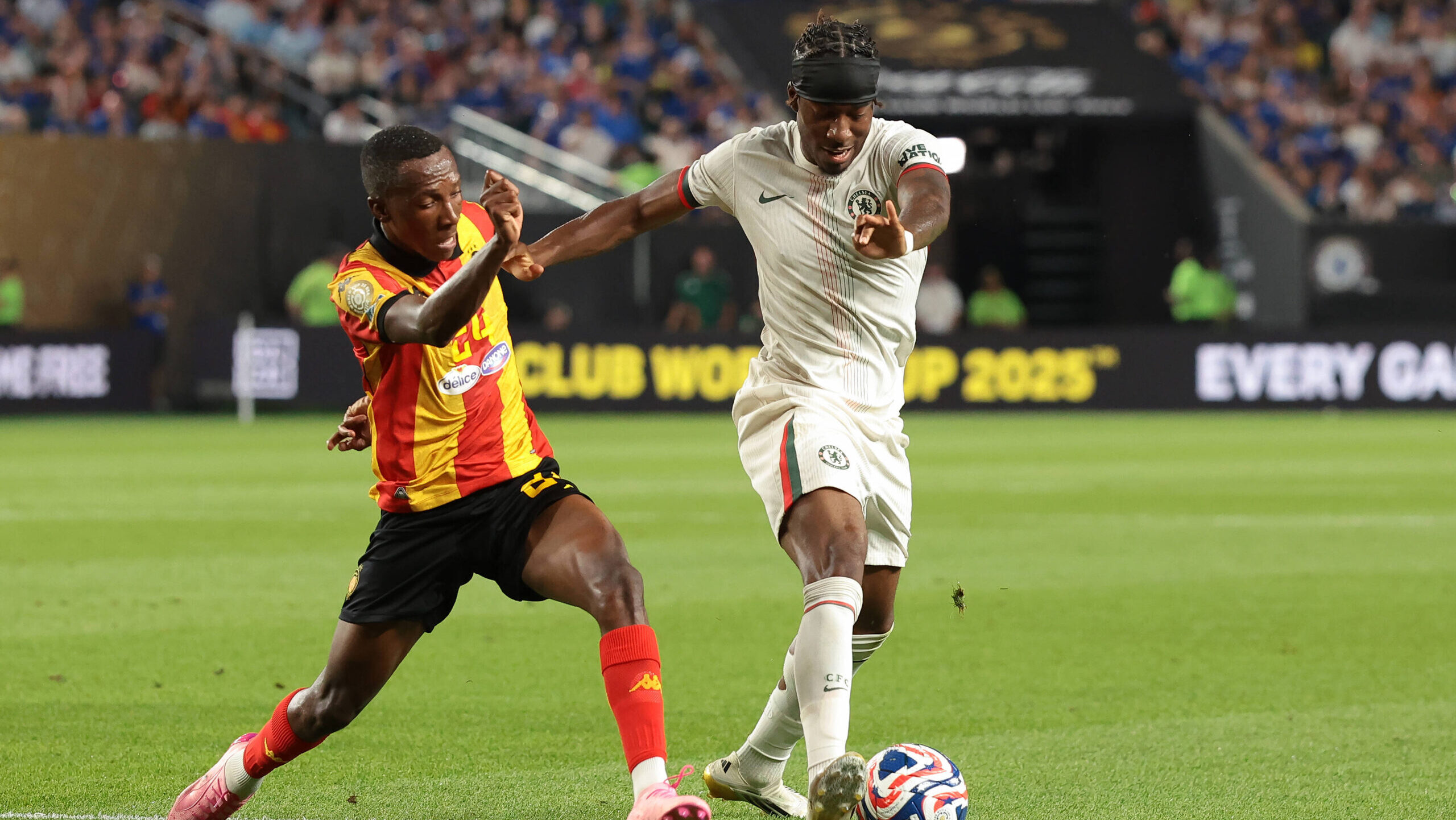 Philadelphia, USA, 24th June 2025.Elias Mokwana of Esperance Sportive de Tunis challenges Noni Madueke of Chelsea FC during the ES Tunis vs Chelsea FIFA Club World Cup match at Lincoln Financial Field, Philadelphia. Picture credit should read: Jonathan Moscrop / Sportimage EDITORIAL USE ONLY. No use with unauthorised audio, video, data, fixture lists, club/league logos or live services. Online in-match use limited to 120 images, no video emulation. No use in betting, games or single club/league/player publications. SPI_094_JM_TUNIS_CHELSEA_ SPI-3981-0094