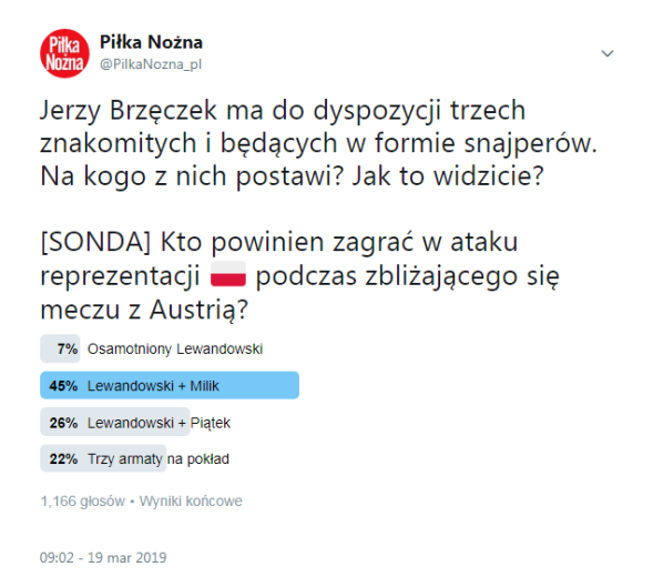 Postanowiliśmy zapytać naszych czytelników, jak oni widzą zestawienie formacji napadu na początku eliminacji? Co się okazało? Ich zdaniem optymalnym wariantem (45 procent wszystkich głosów) byłoby postawienie na Lewandowskiego i Milika, a więc zgrany i sprawdzony duet. Nieco mniej typów (26 procent) padło na parę Lewandowski – Piątek, a sporo osób uznało, że warto jednak zaryzykować (22 procent) i wytoczyć na wojnę wszystkie trzy działa.