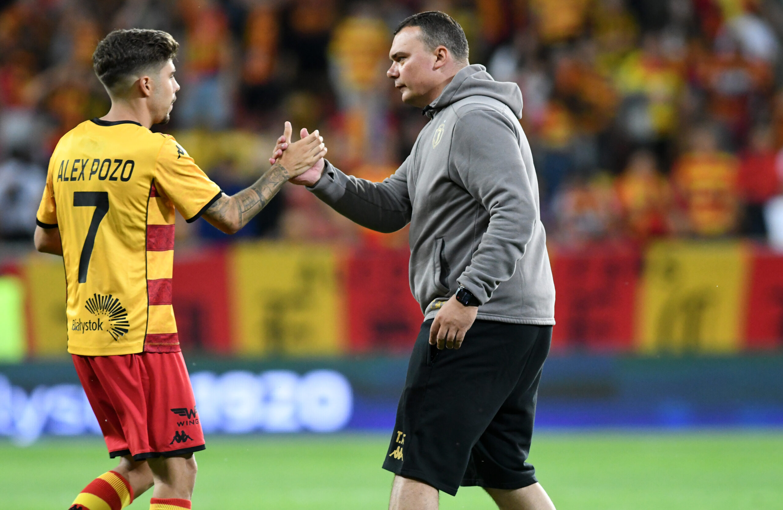 2025.07.31 Bialystok pilka nozna 2. runda eliminacji Liga Konferencji Europy 2025/2026 Jagiellonia Bialystok (zolto-czerwone) - FK Novi Pazar N/z koniec meczu (L-P) Alejandro Pozo Adrian Siemieniec trener Jagiellonii Bialystok Foto Michal Kosc / PressFocus