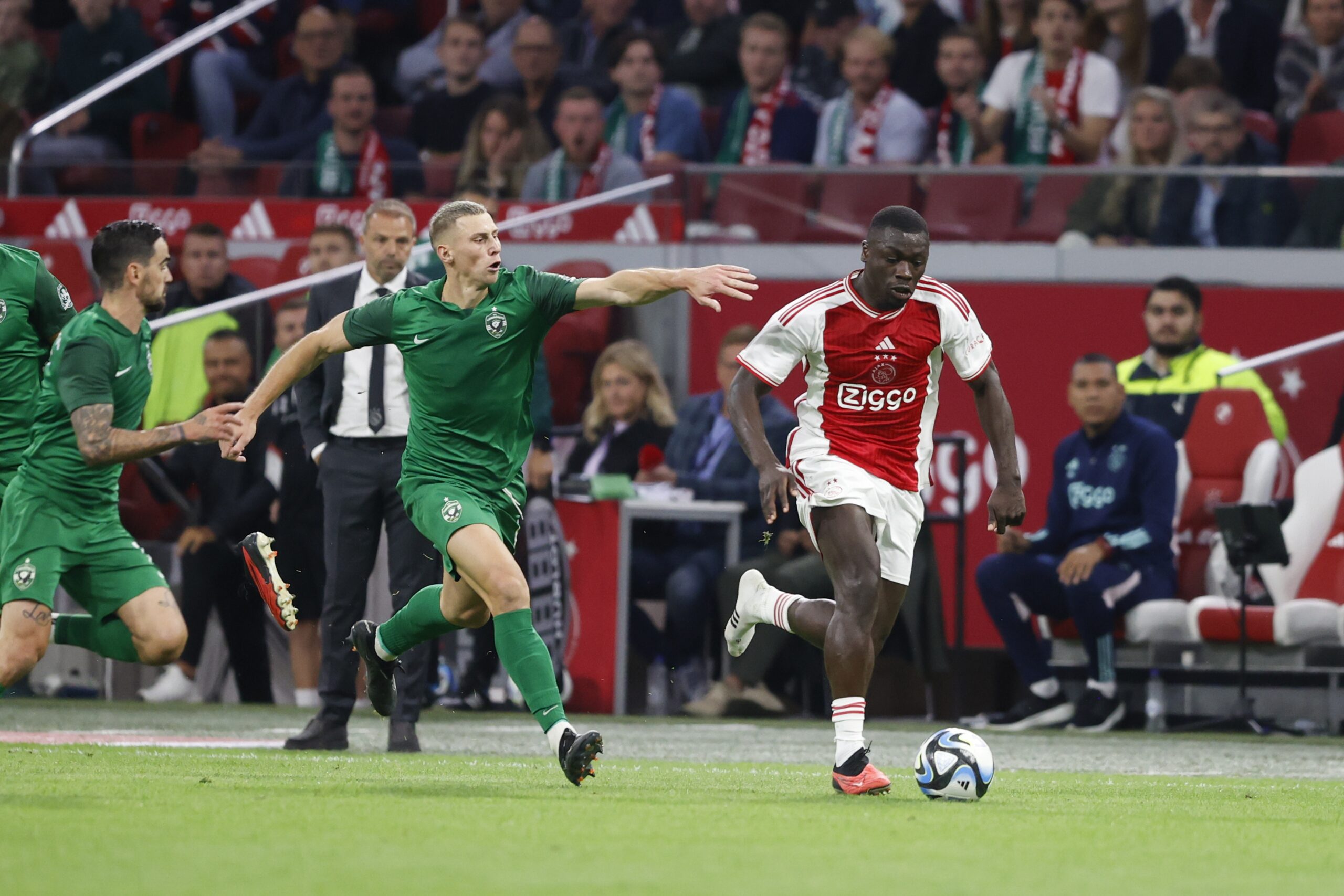 AMSTERDAM , 31-08-2023 , Johan Cruijff Arena , UEFA Europa League  season 2023 / 2024 , Play-offs 2nd leg , match between Ajax and Ludogorets , (L-R) Ludogorets Razgrad player Jakub Piotrowski, Ajax player Brian Brobbey (Photo by Pro Shots/Sipa USA)