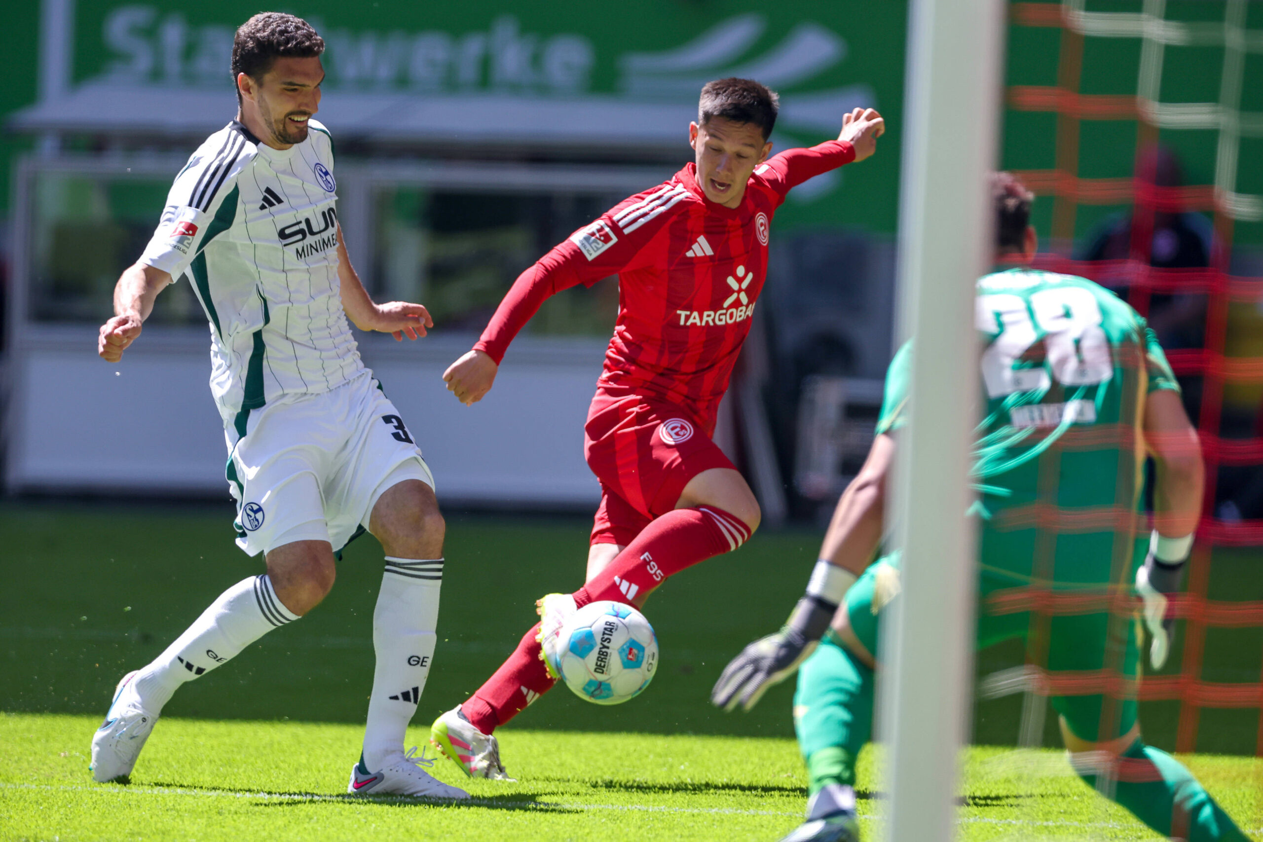 10.05.2025, Fussball, Fortuna Dusseldorf - FC Schalke 04, 2. Fussball Bundesliga, Merkur Spiel-Arena, Saison 2024 2025: Marcin Kaminski Schalke04 35 im Zweikampf gegen Shinta Appelkamp Fortuna Duesseldorf 23 DFB regulations prohibit any use of photographs as image sequences and or quasi-video. Nordrhein-Westfalen Deutschland *** 10 05 2025, Football, Fortuna Dusseldorf FC Schalke 04, 2 Fussball Bundesliga, Merkur Spiel Arena, Saison 2024 2025 Marcin Kaminski Schalke04 35 in duel against Shinta Appelkamp Fortuna Duesseldorf 23 DFB regulations prohibit any use of photographs as image sequences and or quasi video Nordrhein Westfalen Germany