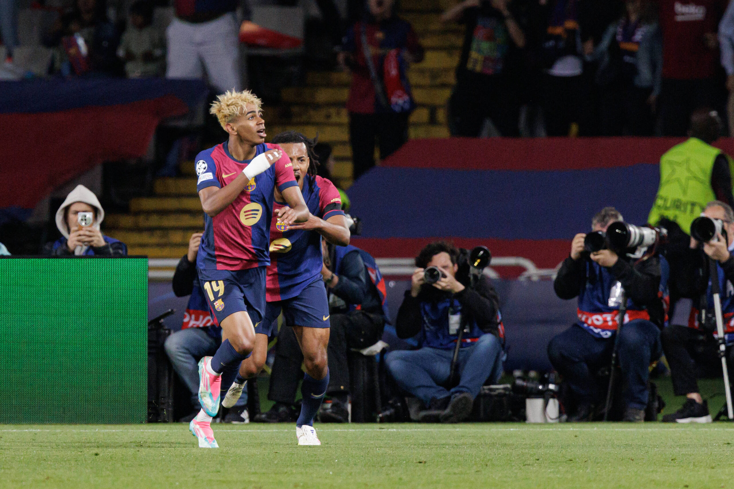 Lamine Yamal seen celebrating after scoring goal during UEFA Champions League game between teams of FC Barcelona, Barca and Internazionale Milano Maciej Rogowski Barcelona Estadi Olimpic Lluis Companys Spain Copyright: xMaciejxRogowskix fcbvsinter2425-13