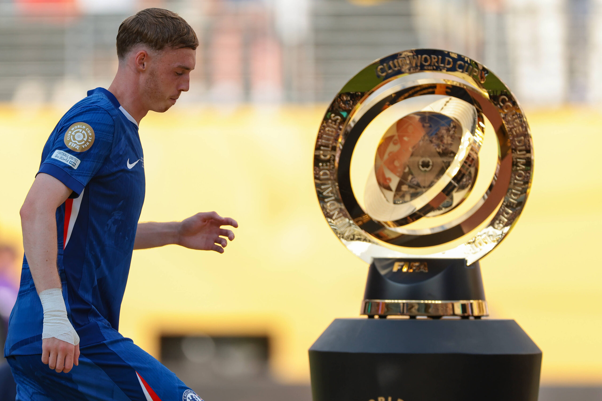 New Jersey, USA, 13th July 2025. Cole Palmer of Chelsea FC walks past the trophy following the final whistle of the Chelsea vs Paris Saint Germain FIFA Club World Cup match at Metlife Stadium, New Jersey. Picture credit should read: Jonathan Moscrop / Sportimage EDITORIAL USE ONLY. No use with unauthorised audio, video, data, fixture lists, club/league logos or live services. Online in-match use limited to 120 images, no video emulation. No use in betting, games or single club/league/player publications. SPI_214_JM_CHELSEA_PSG_ SPI-4016-0214
