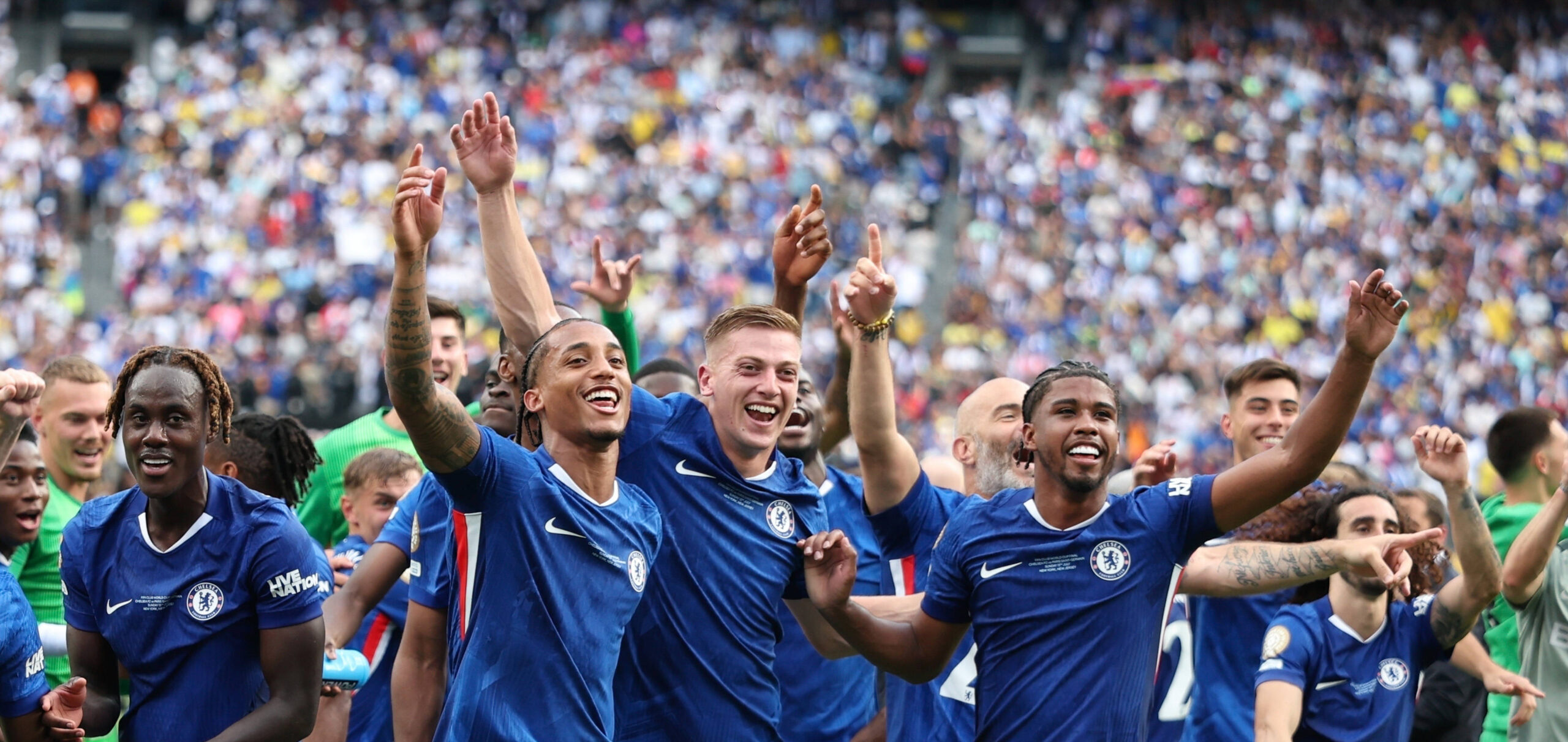 Chelsea FC v Paris Saint-Germain - FIFA Club World Cup 2025 Final Joao Pedro 20 and Liam Delap 9 of Chelsea FC celebrating after the victory against Paris Saint-Germain during the FIFA Club World Cup 2025 Final match between Chelsea FC and Paris Saint-Germain at MetLife Stadium. on July 13, 2025 in East Rutherford, New Jersey. East Rutherford New Jersey United States Copyright: xHoracioxZamoraxRiosx