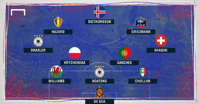 David De Gea (Hiszpania) – Giorgio Chiellini (Włochy), Jerome Boateng (Niemcy), Ashley Williams (Walia) – Grzegorz Krychowiak (Polska), Renato Sanches (Portugalia), Julian Draxler (Niemcy), Xherdan Shaqiri (Szwajcaria) –  Eden Hazard (Belgia), Antoine Griezmann (Francja), Kolbeinn Sigthorsson (Islandia)