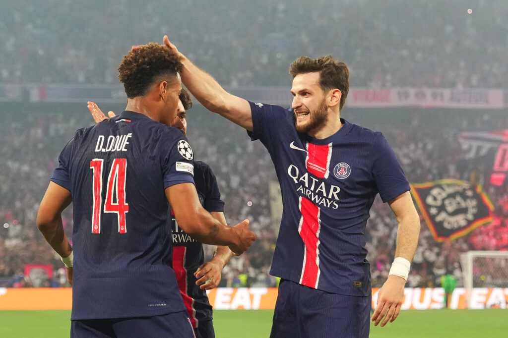 William Joel Tenorio Pacho ( 51 - PSG ) , Marquinhos ( 5 - PSG ) , Joao Pedro Goncalves Neves ( 87 - PSG ) and Vitinha Vitor Machado ( 17 - PSG ) during the UEFA Champions League match between Paris Saint Germain and Arsenal FC at Parc Des Princes on May 07 , 2025 in Paris, France. ( Photo by Dante Badano / PsnewZ ) - - Photo :   / Dante Badano / PsnewZ / SIPA /00308722_0054//Credit:PSNEWZ/SIPA/2505080045