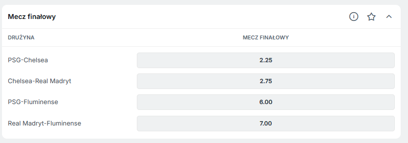Znacznie niższe szanse są na finał z udziałem Fluminense. W parze z PSG to kurs 6.00, natomiast z Realem Madryt 7.00. Będzie niespodzianka?