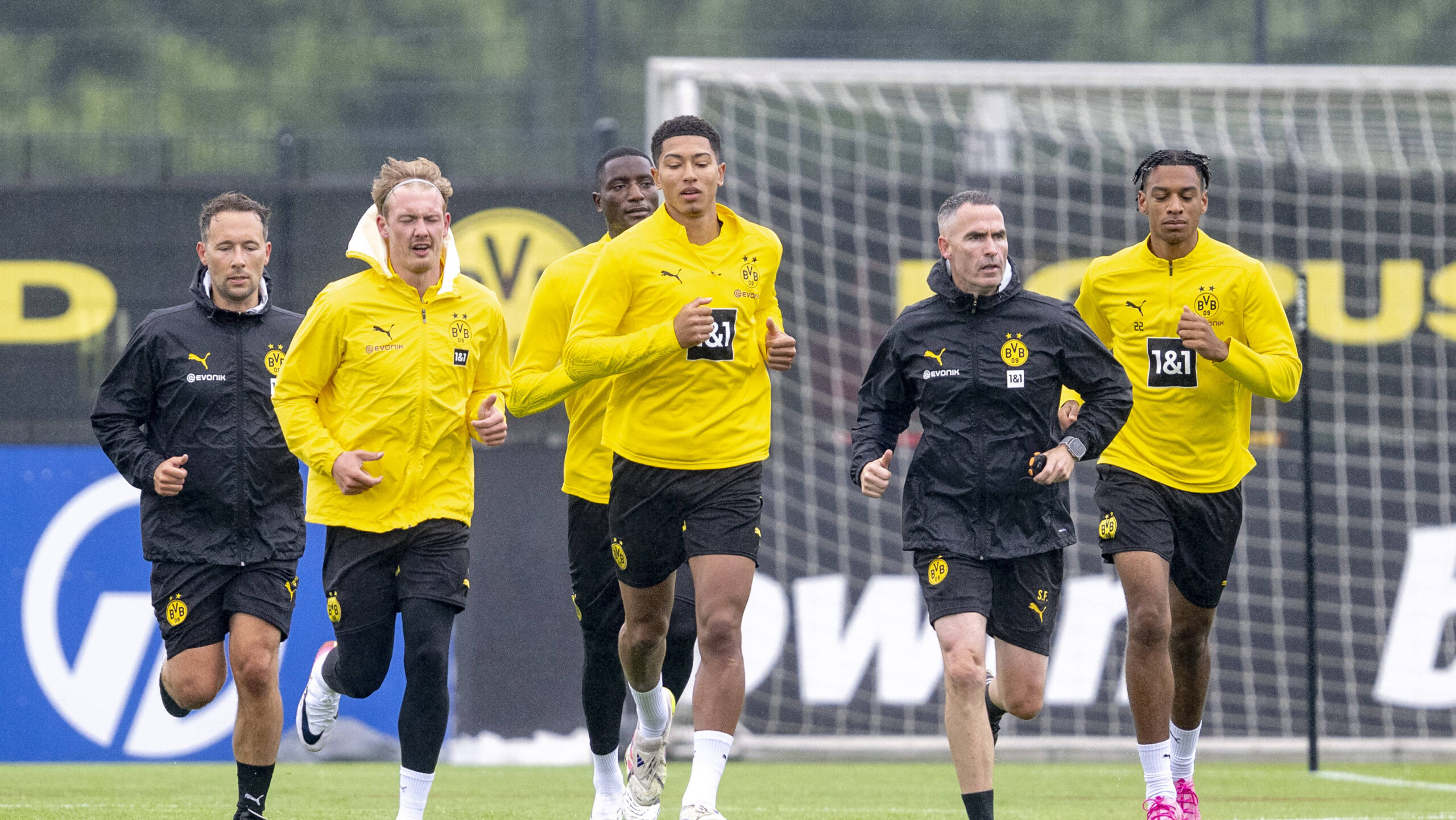 10.06.2025: Fussball: Training von Borussia Dortmund auf dem Trainingsgelande in Brackel. Alex Clapham l-r, Dortmunds Julian Brandt, Dortmunds Serhou Guirassy, Jobe Bellingham, Shad Forsythe und Filippo Mane laufen. *** 10 06 2025 Borussia Dortmund soccer training at the training ground in Brackel Alex Clapham l r , Dortmunds Julian Brandt, Dortmunds Serhou Guirassy, Jobe Bellingham, Shad Forsythe and Filippo Mane run Copyright: xDavidxInderliedx