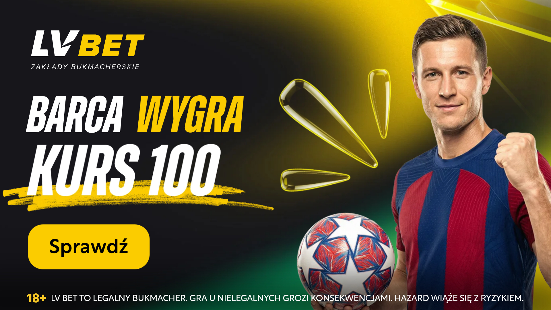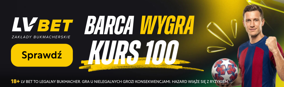 Wpłać minimum 50 PLN i postaw dokładnie 2 PLN – ze środków własnych lub bonusowych – na zwycięstwo Barcelony z Getafe. Jeśli Duma Katalonii wygra, LV BET rozliczy Twój zakład po kursie 100!