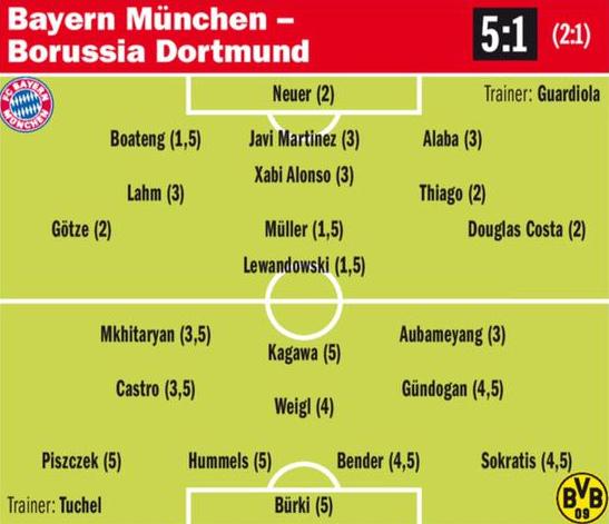 Fachowcy „Kickera” przyznali Lewandowskiemu ocenę (1,5) w sześciostopniowej skali, gdzie „jedynka” oznacza występ na poziomie klasy światowej. Snajper Bayernu otarł się więc o ideał, podobnie jak jego klubowi koledzy – Thomas Mueller i Jerome Boateng, którzy także otrzymali noty (1,5).