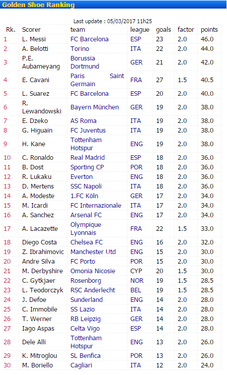 Złoty Buty (ranking na 05.03.2017 r.)