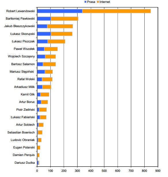 Raport dotyczy wszystkich publikacji jakie ukazały się w lipcu na temat danych zawodników w prasie i Internecie. Jak się okazało, o Robercie Lewandowskim napisano w tym czasie ponad trzysta artykułów w prasie i ponad pięćset w sieci.