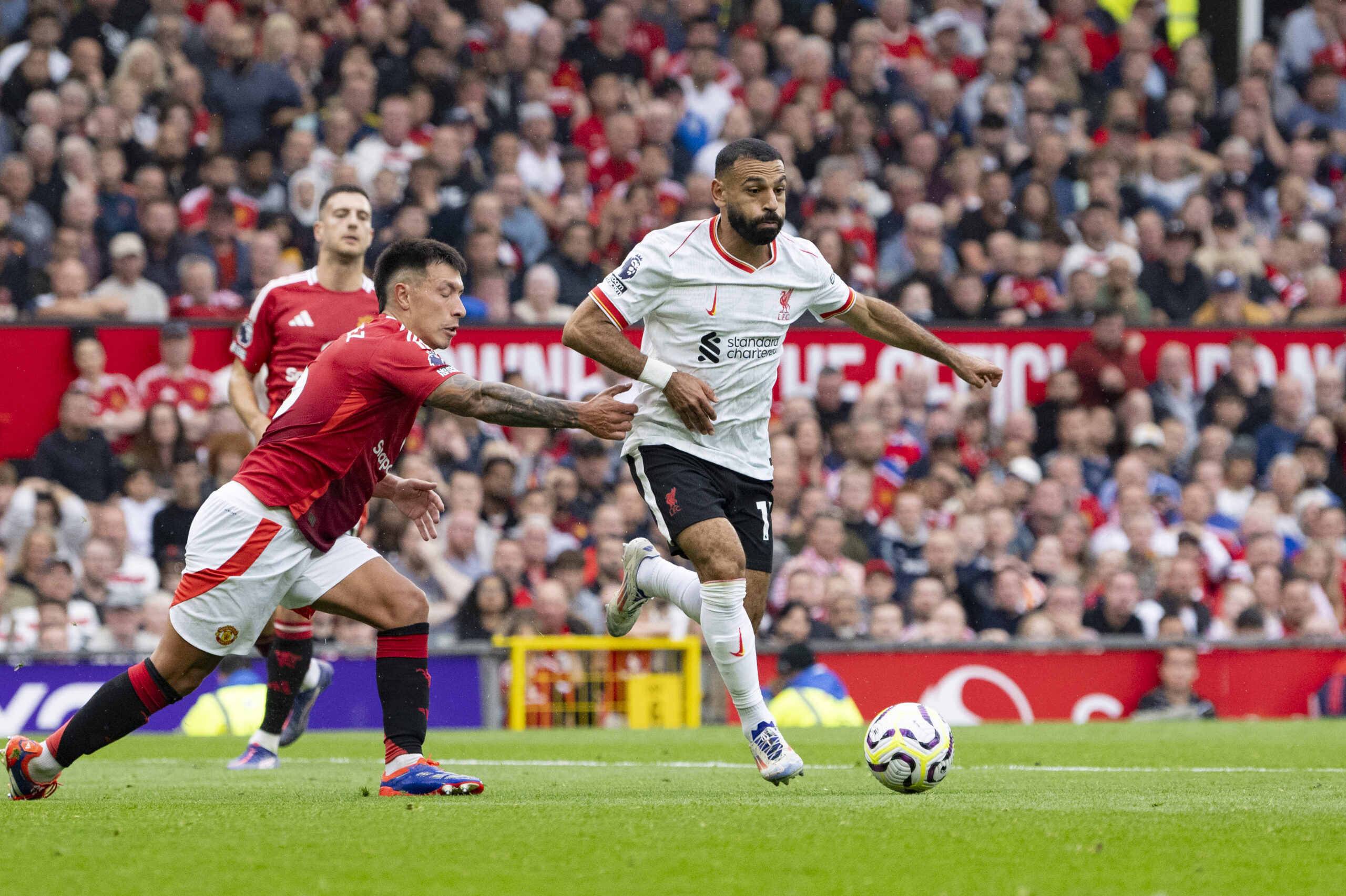 MANCHESTER, ENGLAND - SEPTEMBER 01: Mohamed Salah of Liverpool (R) is challenged by Lisandro Mart’nez of Manchester United (L) during the Premier League football match between Manchester United and Liverpool at Old Trafford on September 01, 2024 in Manchester, England. (Photo by Richard Callis/SPP)  (Richard Callis / SPP) (Photo by Richard Callis / SPP/Sipa USA)