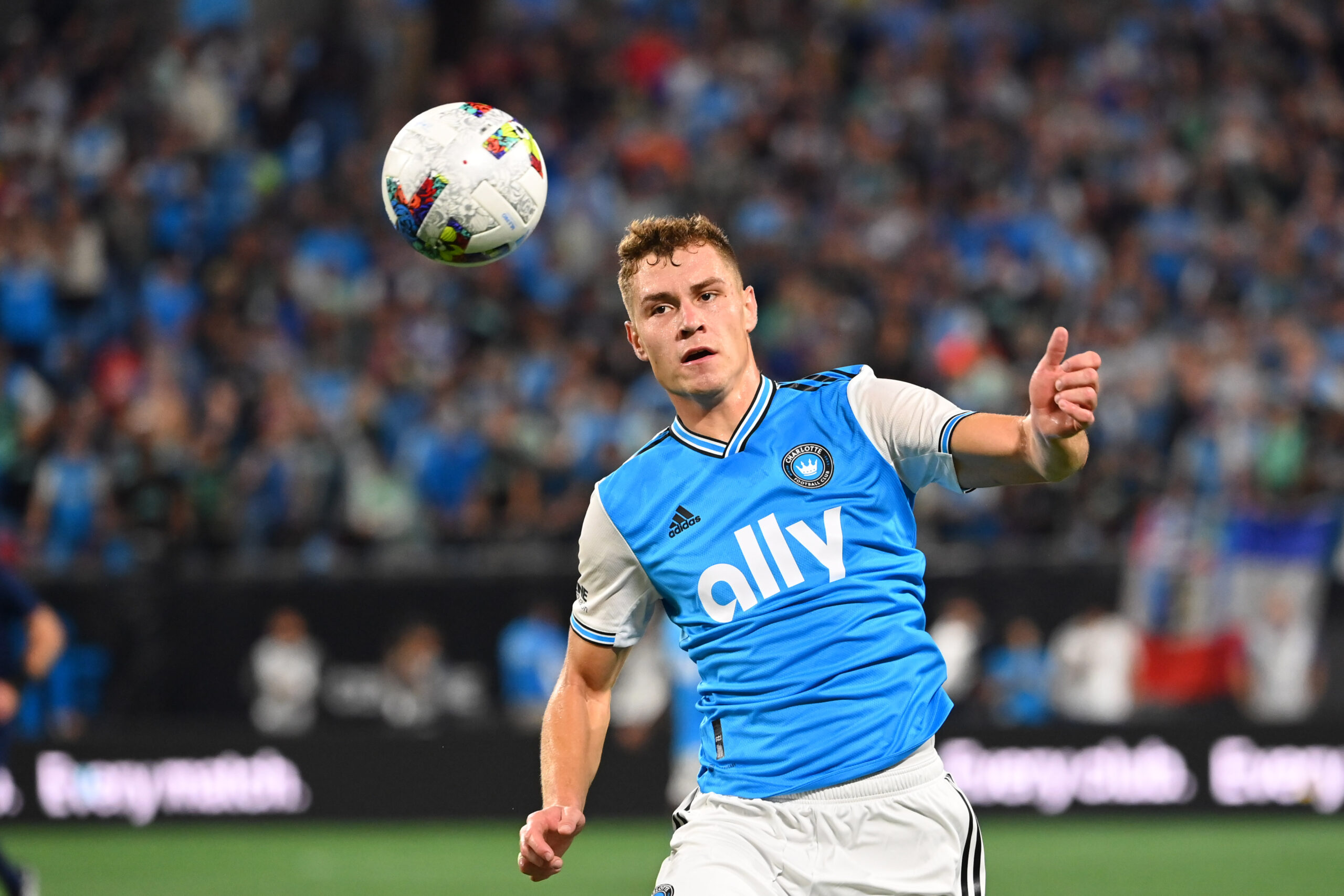 Oct 5, 2022; Charlotte, North Carolina, USA; Charlotte FC defender Jan Sobocinski (2) heads the ball in the second half at Bank of America Stadium. Mandatory Credit: Bob Donnan-USA TODAY Sports/Sipa USA