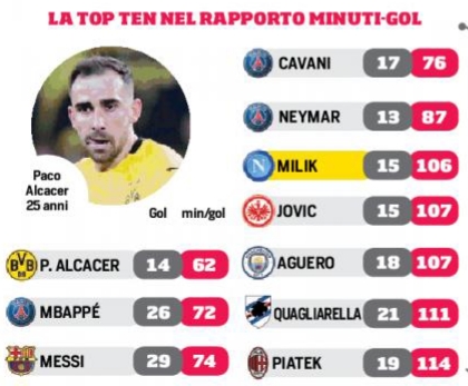 Dziennikarze Corriere dello Sport sporządzili klasyfikację napastników, którzy mają najlepszy stosunek goli do rozegranych minut. W czołowej dziesiątce znalazło się dwóch Polaków: Arkadiusz Milik oraz Krzysztof Piątek.