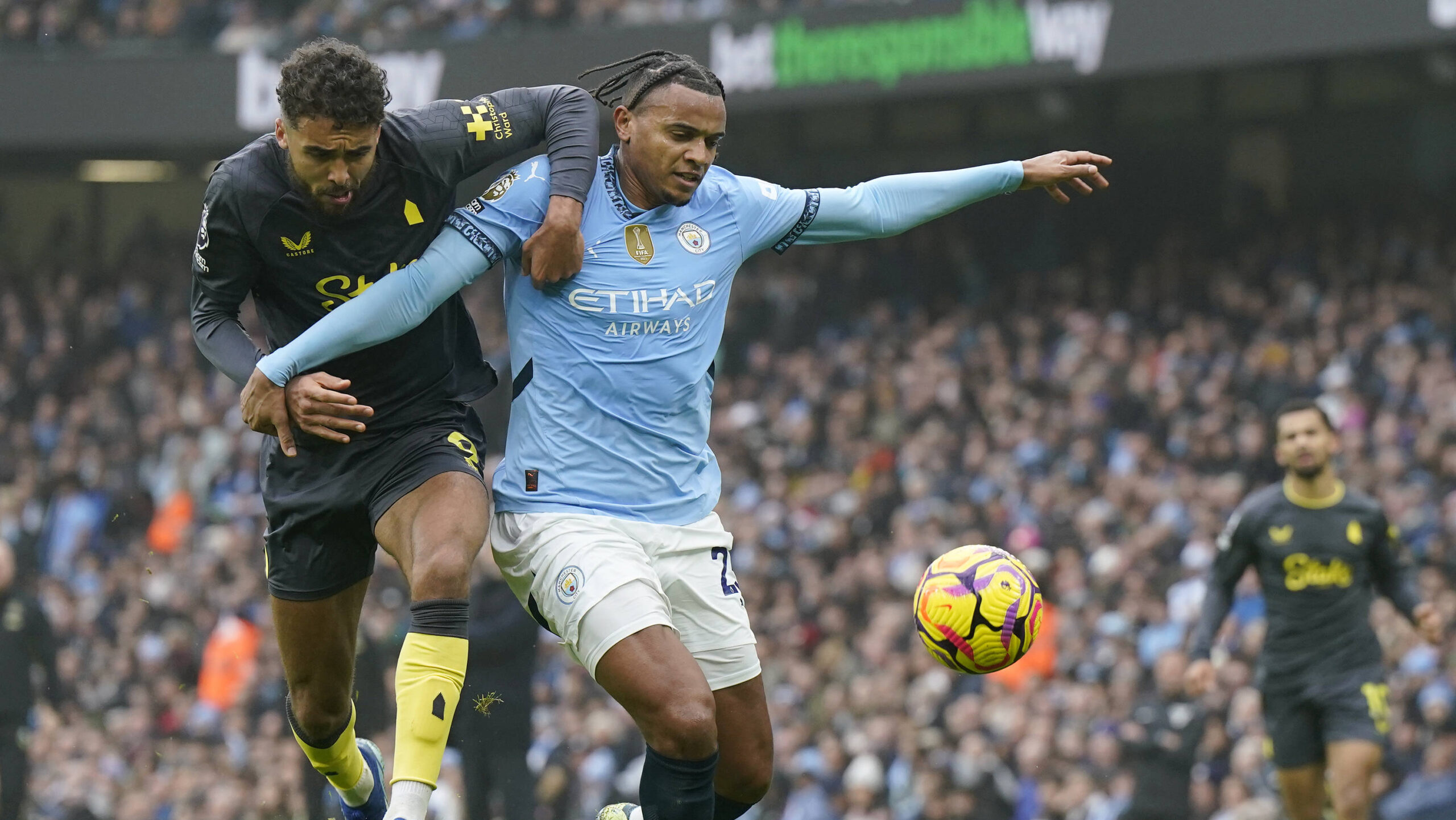 Manchester, England, 26th December 2024. Dominic Calvert Lewin of Everton L challenges Manuel Akanji of Manchester City during the Premier League match at the Etihad Stadium, Manchester. Picture credit should read: Andrew Yates / Sportimage EDITORIAL USE ONLY. No use with unauthorised audio, video, data, fixture lists, club/league logos or live services. Online in-match use limited to 120 images, no video emulation. No use in betting, games or single club/league/player publications. SPI_003_AY_MAN_CITY_EVERTON SPI-3550-0003