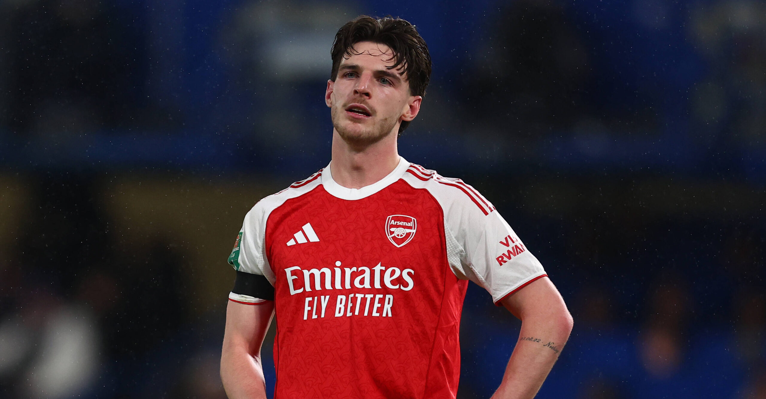 London, England, 14th January 2026. Declan Rice of Arsenal during the Chelsea vs Arsenal Carabao Cup match at Stamford Bridge, London. Picture credit should read: Paul Terry / Sportimage EDITORIAL USE ONLY. No use with unauthorised audio, video, data, fixture lists, club/league logos or live services. Online in-match use limited to 120 images, no video emulation. No use in betting, games or single club/league/player publications. SPI_120_PT_Chelsea_Arsenal SPI-4450-0119