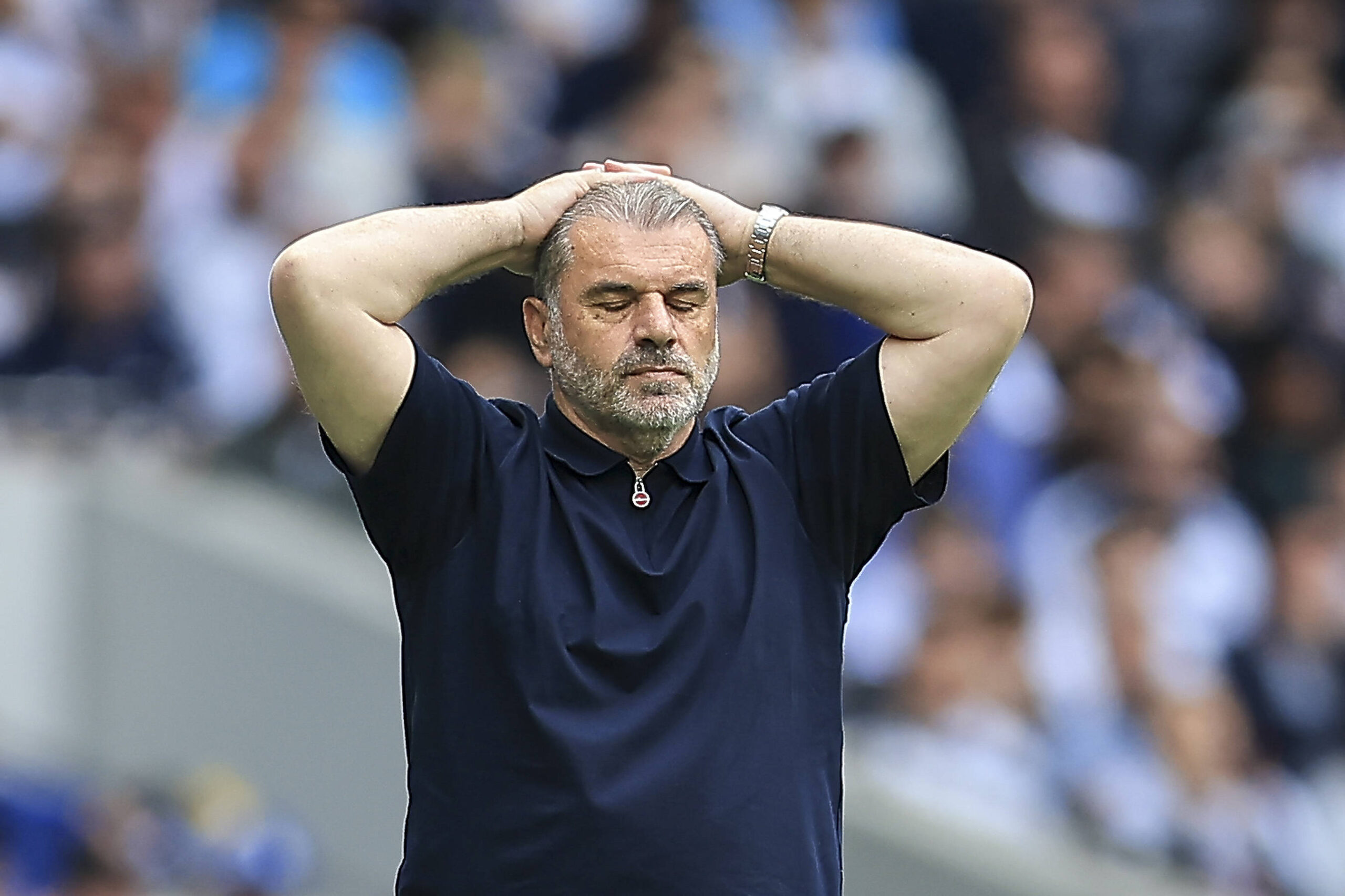 Tottenham Hotspur v Brighton and Hove Albion Premier League 25/05/2025. Tottenham Hotspur Manager Ange Postecoglou with his hands on his head during the Premier League match between Tottenham Hotspur and Brighton and Hove Albion at Tottenham Hotspur Stadium, London, United Kingdom on 25 May 2025. Editorial use only DataCo restrictions apply See www.football-dataco.com , Copyright: xChrisxFoxwellx PSI-22153-0185