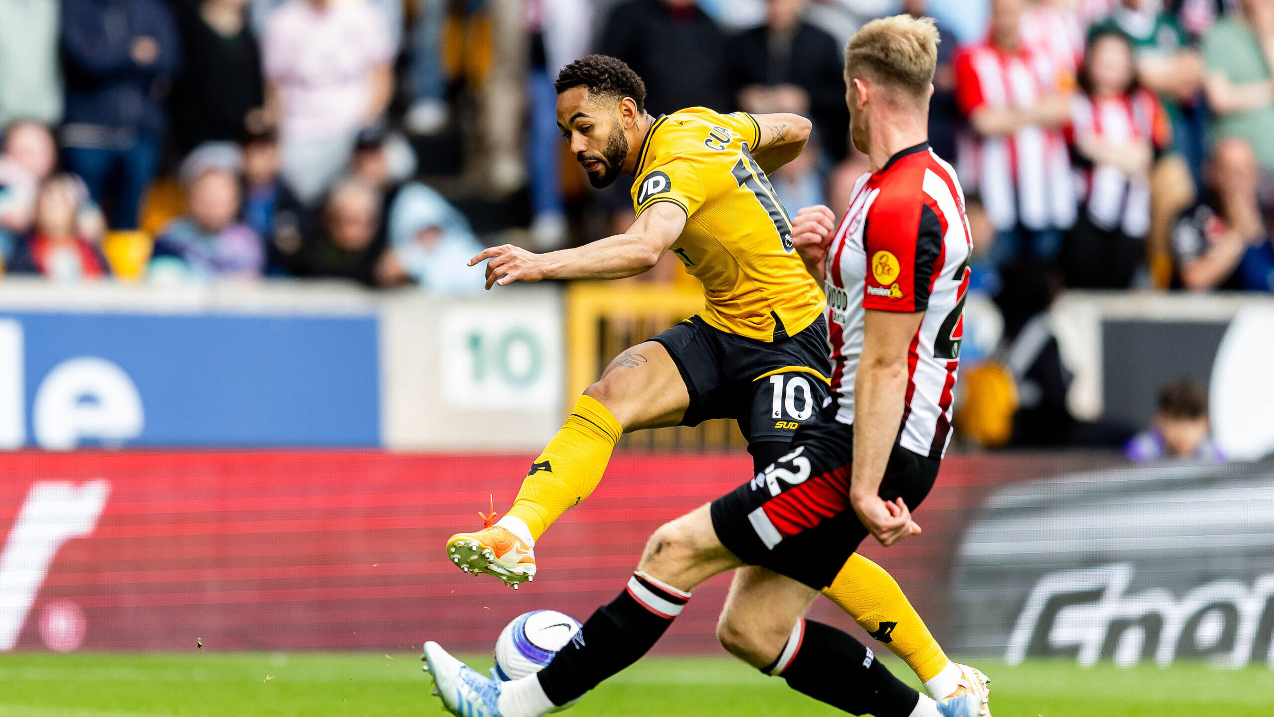 Wolverhampton Wanderers v Brentford Premier League 25/05/2025. Wolverhampton Wanderers forward Matheus Cunha 10 crosses the ball during the Premier League match between Wolverhampton Wanderers and Brentford at Molineux, Wolverhampton, England on 25 May 2025. Wolverhampton Molineux West Midlands England Editorial use only DataCo restrictions apply See www.football-dataco.com , Copyright: xManjitxNarotrax PSI-22187-0017