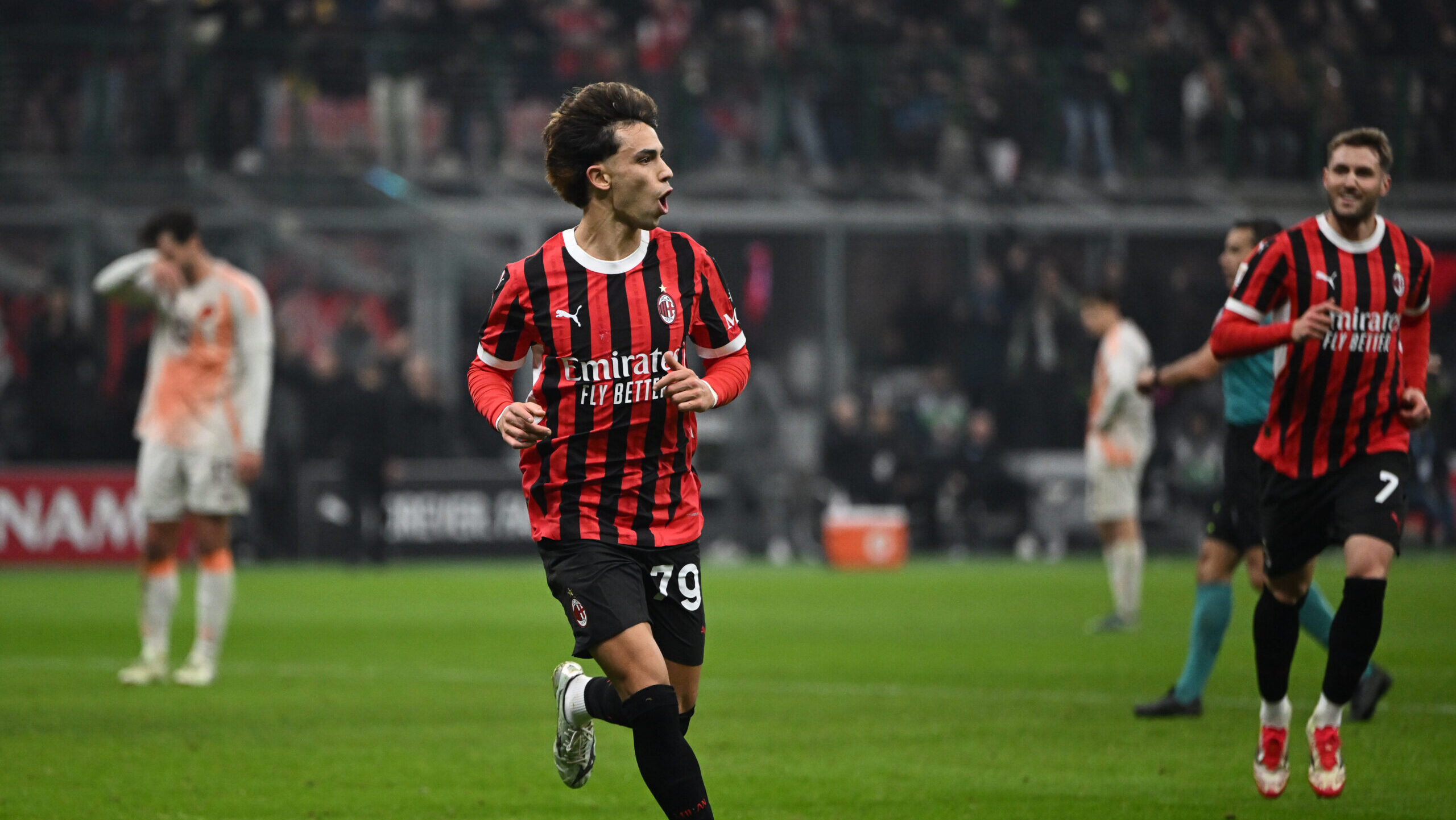 Joao Felix of AC Milan celebrating after a goal during the Coppa Italia round of quarter finals match between AC Milan and AS Roma on 5 February 2025 at Giuseppe Meazza San Siro Siro stadium in Milan, Italy (Photo by Tiziano Ballabio/IPA Sport / ipa-agency.net/IPA/Sipa USA)
