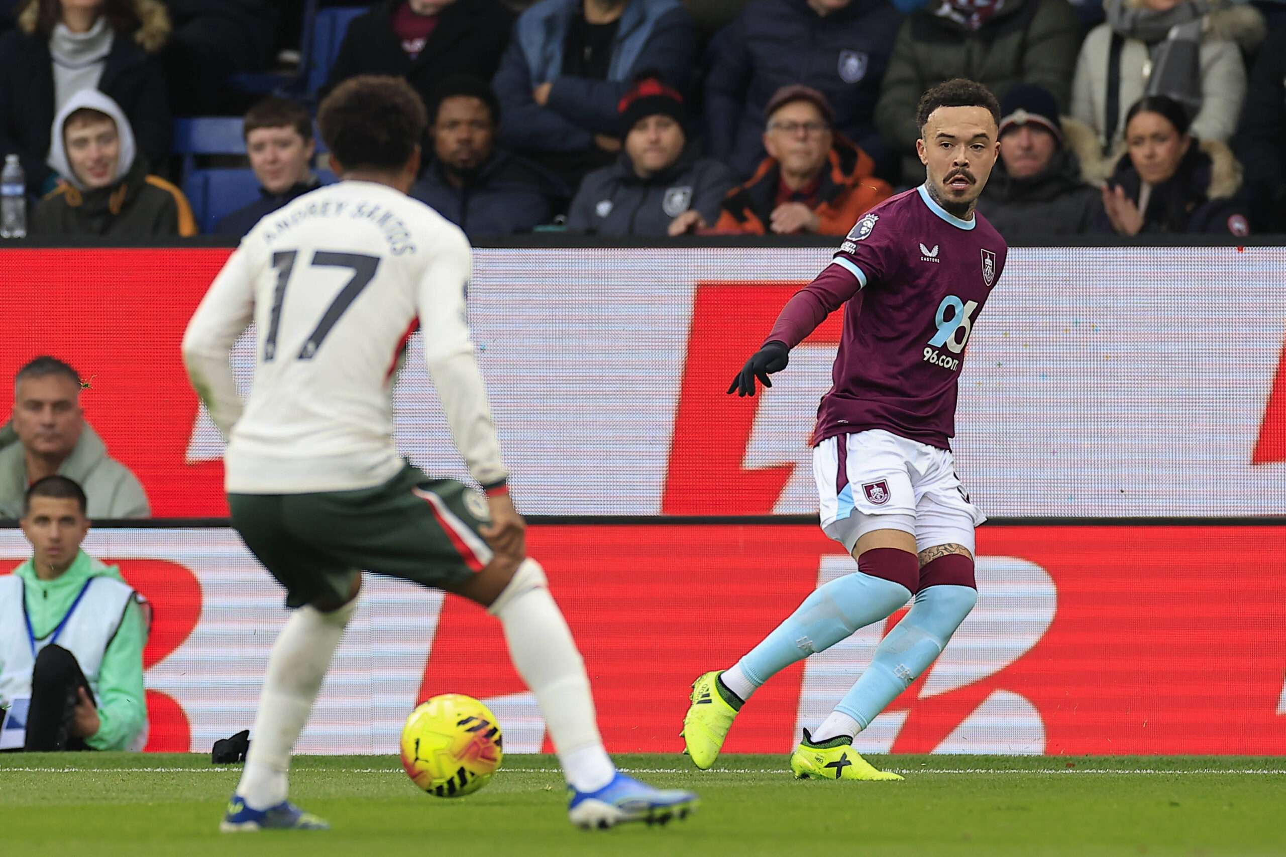 Burnley v Chelsea Premier League 22/11/2025. Quilindschy Hartman 3 of Burnley passes the ball during the Premier League match between Burnley and Chelsea at Turf Moor, Burnley, England on 22 November 2025. Burnley Turf Moor Lancashire England Editorial use only DataCo restrictions apply See www.football-dataco.com , Copyright: xConorxMolloyx PSI-23234-0128
