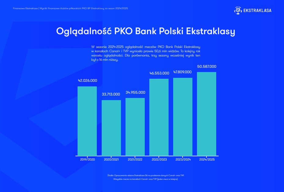 W sezonie 2024-25 oglądalność meczów PKO Bank Polski Ekstraklasy w kanałach Canal+ i TVP wyniosła prawie 50,6 mln widzów. To kolejny rok, kiedy zanotowany został wzrost oglądalności.