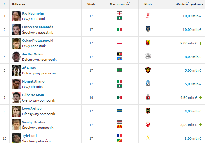 W niej góruje wielki talent Liverpoolu, Rio Ngumoha (10 mln euro) oraz Francesco Camarda z Lecce. (10 milionów euro)