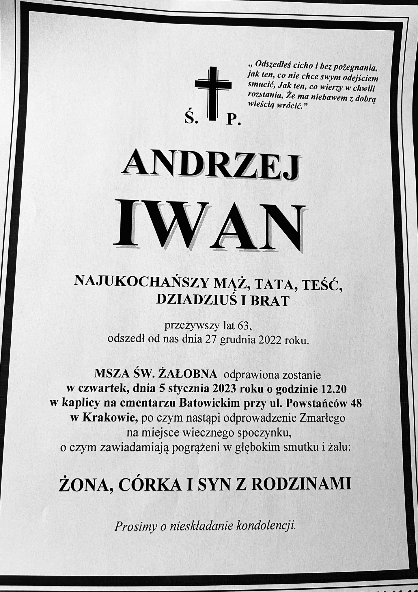 Rodzina Andrzeja Iwana poinformowała o terminie jego pogrzebu.